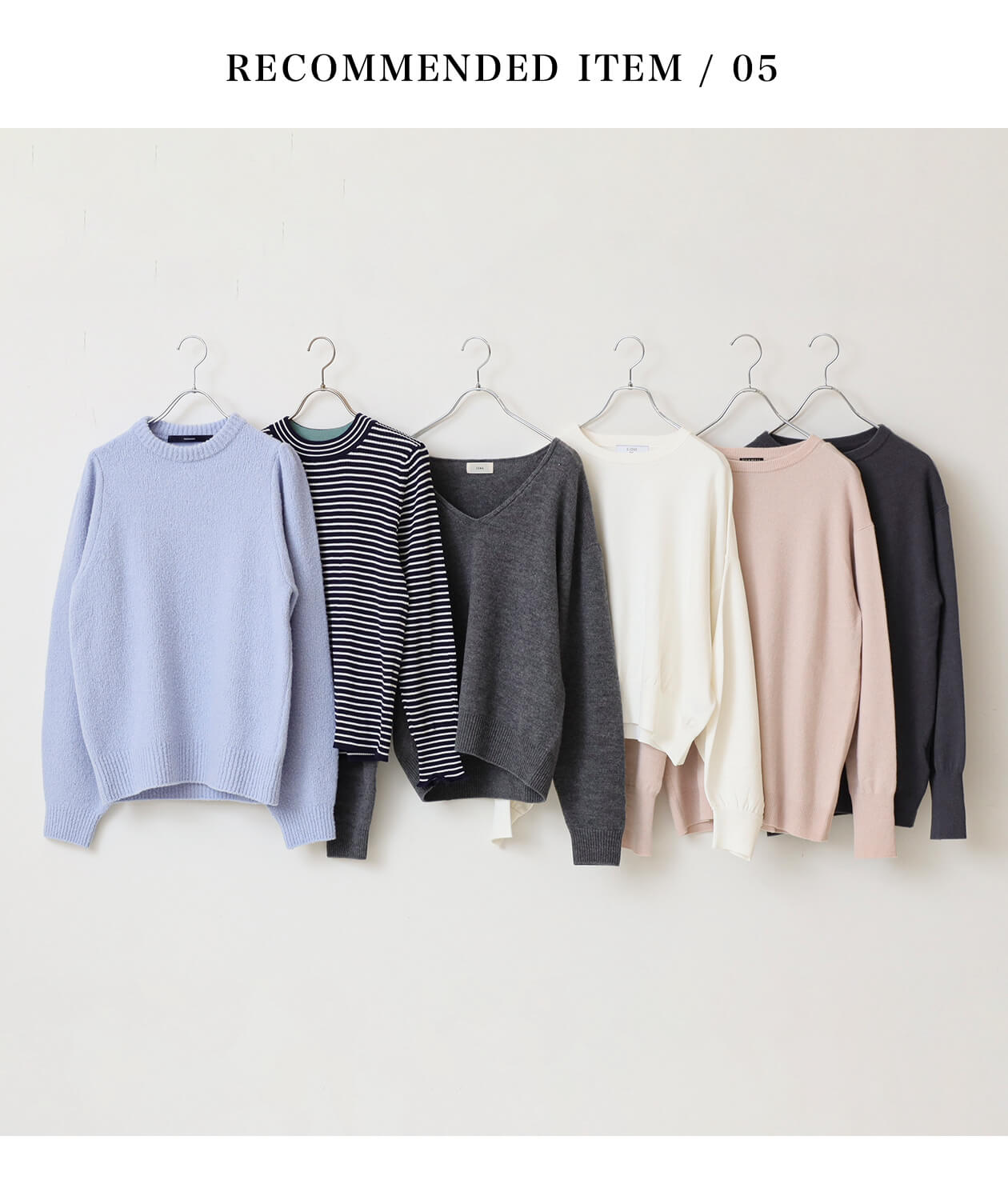 - シンプルなニットプルオーバーはニュートラルなグレーの他に、こなれ感抜群のダスティカラーをセレクト。鮮やかすぎないミルキーな色味でまろやかさを出すのがポイントです。ブークレ素材のボリュームシルエットなど、女性らしく表情のあるデザインをカジュアルに合わせるのが今っぽい。