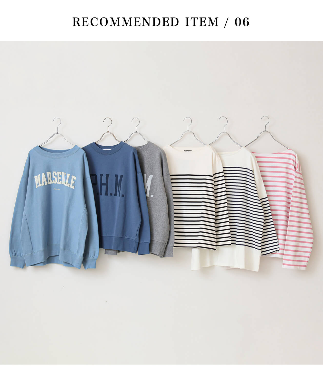 - ロゴスウェットはブルーやグレーなど、ヴィンテージっぽい色味をチョイス。ボーダーは定番のモノトーンのほか、変わりダネのブラウンとピンクもサマータイプのカラー。パネルボーダーは一点投入で爽やかさがでるのでおすすめ。気分に合わせて選べるカラーバリエーションが豊富なのが嬉しい。