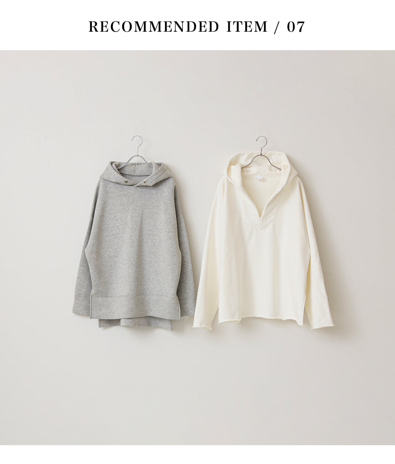 - カジュアルな印象のフーディはベーシックカラーのグレーとホワイトをチョイス。明るさとこなれ感のある色味で、どんなアイテムとも相性抜群です。CITYSHOPの白スウェットは、カットが深めに入ったフロントネックや裾のカットオフがアクセントに◎。
