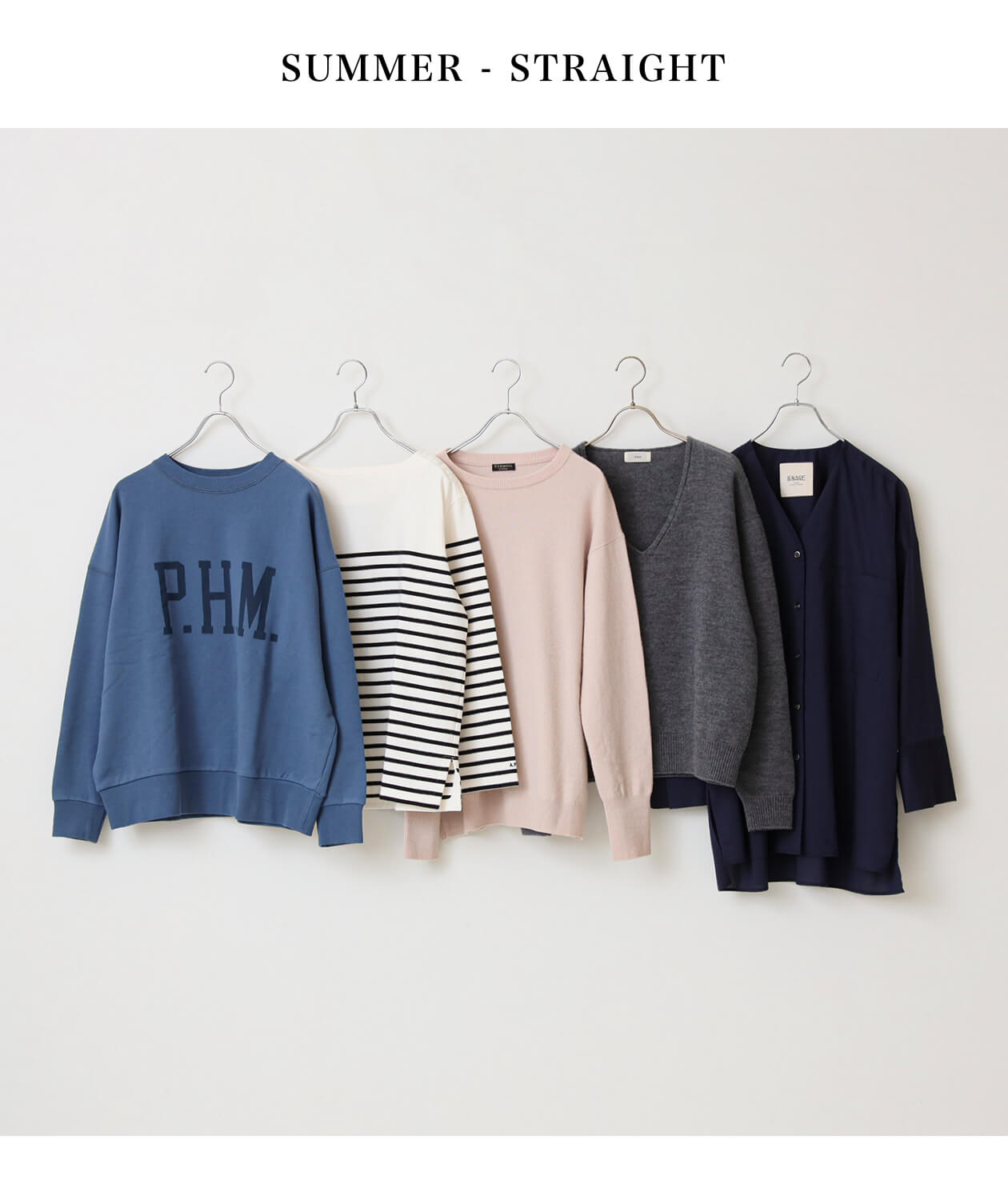 シャツやカットソーなど、奇をてらわないベーシックなデザインが一番サマになるストレートタイプ。キレイめなデザインはもちろん、ボーダーやロゴなどのカジュアルなアイテムもおすすめです。ニットは、上質なカシミヤをニュアンスたっぷりのヌードピンクで楽しんで洗練感を上乗せ。 - JOURNAL STANDARD relumeカレッジスウェットP.H.M¥6,600(税込)