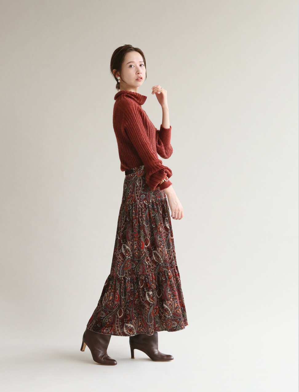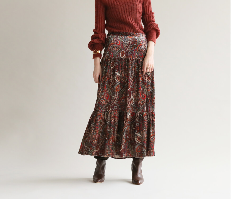 - 艶やかに纏うペイズリー柄のスカート。