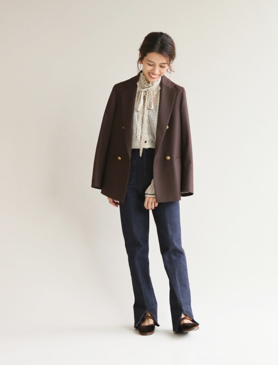 LA BOUCLEのトラッドスタイルには、あえてフェミニンなドット柄のブラウスで。秋はボウタイブラウスでクラシカルな気分。
