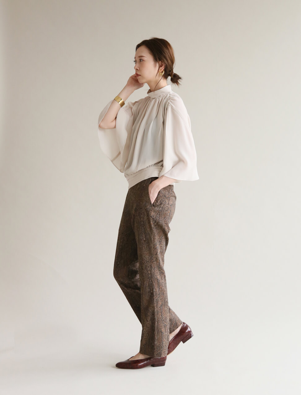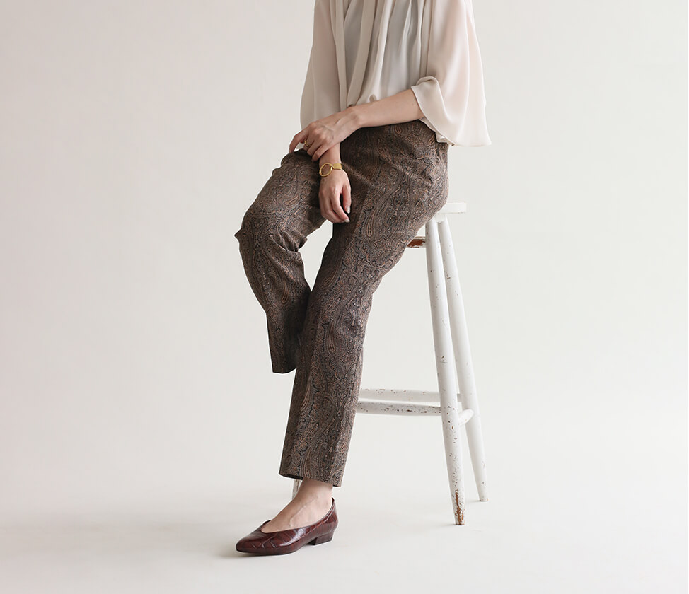 無地ボトムスの感覚で穿ける、ペイズリー柄のパンツはLA BOUCLE別注素材。清潔感のある白を差し色にして上品に着こなすのがLA BOUCLE流。