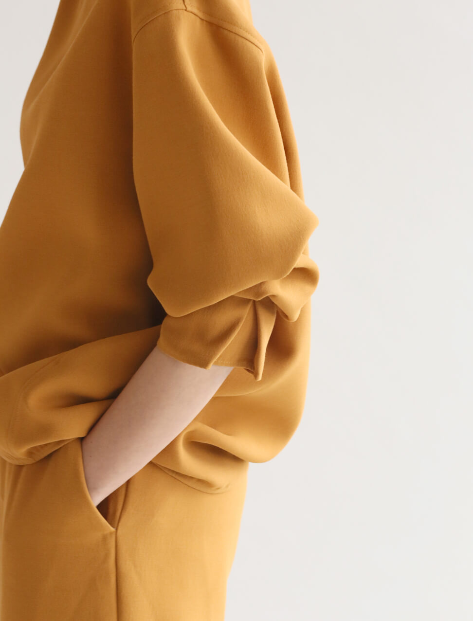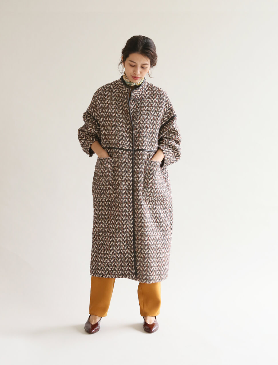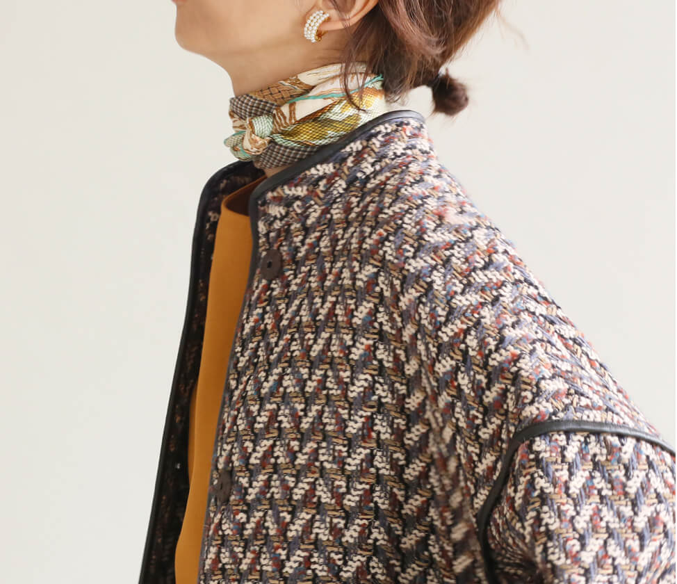 フランスの高級生地メーカーLINTON社のツイードを使用した、存在感のあるコート。自由な感覚で、発色の良いイエローのセットアップやスカーフを組み合わせて、プレイフルな着こなしに。