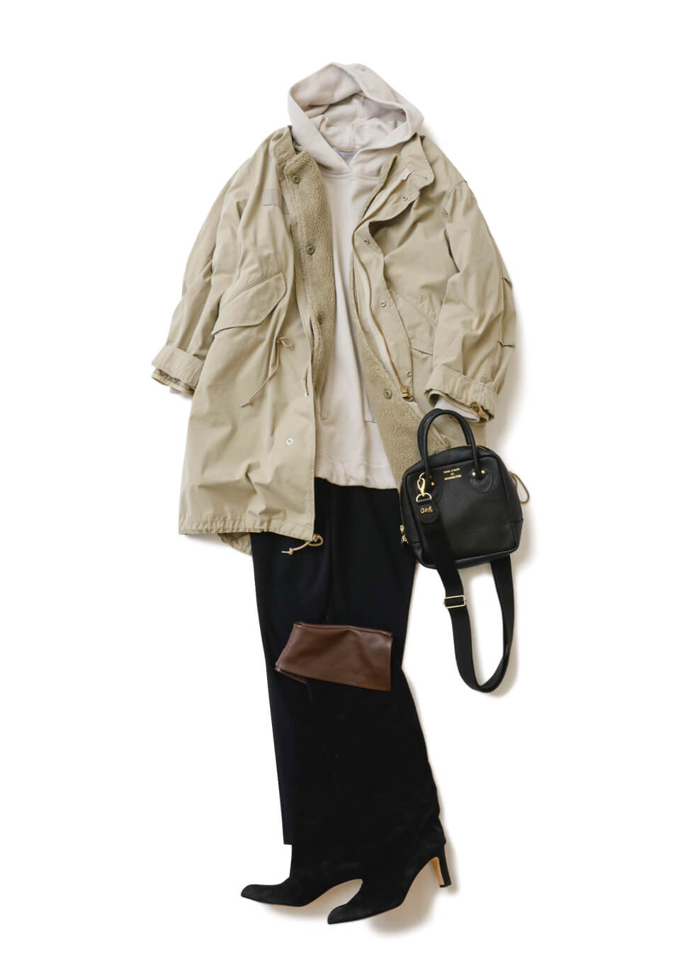 こなれたオーバーサイズのスウェットフードポンチョに、フィールドパーカーをばさっと羽織ったメンズライクなカジュアルで週の始まりをゆるっとスタート。とはいえボトムスは黒レギンス、足元はロングブーツをつないでピリッと緊張感を加えて。ブーツはバイカラーの折り返しデザインがモードなスパイスに◎。
