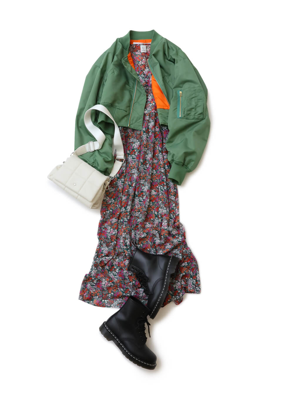 一点投入でロマンティックな花柄ワンピースは、今から春まで長く活躍する主役アイテム。ゴツめの黒ブーツとMA-1をトッピングして、甘いだけじゃない大人な辛さもMIX。アウターは、ワンピースコーデをさらにスタイルアップしてくれるコンパクト丈なのが◎。大人な白バッグでクリーンな要素も加えて。