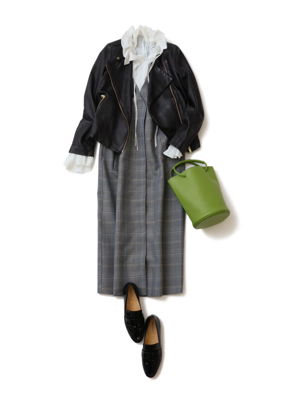 どんどん大人っぽく進化を遂げているジャンスカ。デートの今日は、チェック柄のIラインシルエットがシュッと見えのデザインに、甘いフリルブラウスをインしてレディに仕上げて。とはいえアウターはレザーライダースをチョイスして、スウィートになりすぎない大人バランスに着地。