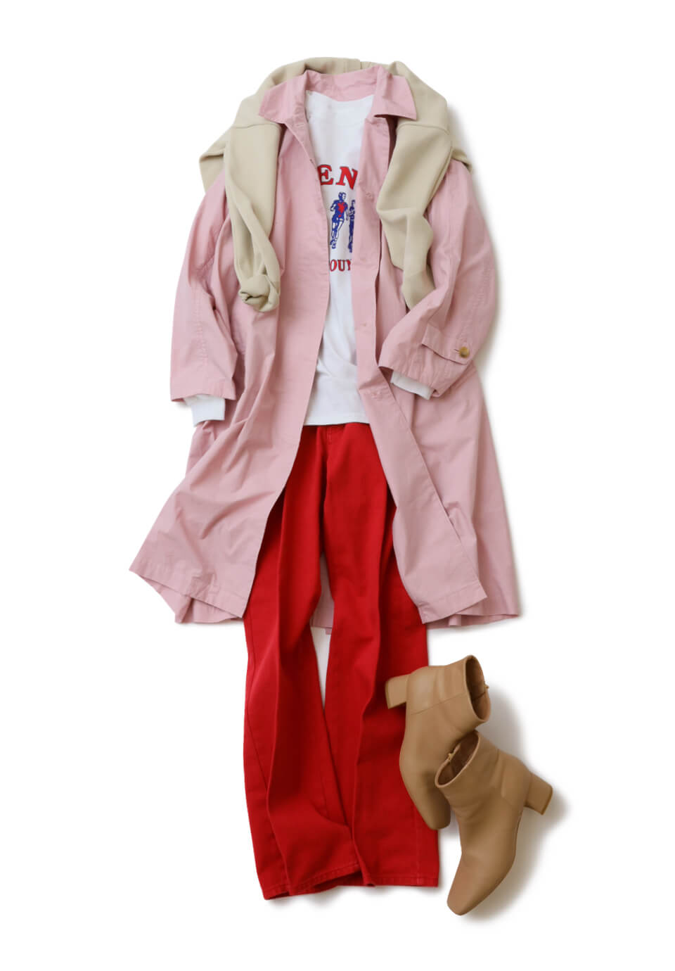 春に向けて気になるのがカラーアイテム。鉄板アウターのステンカラーコートも、今年はほんのり甘いピンクに挑戦してコーデを刷新。意外と合わせるボトムスを選ばず、キャッチーな赤ボトムスともグッドバランス!トップスにも赤を取り入れてリンクさせて。カラーコーデは小物をニュートラルカラーで合わせるのがおすすめ。