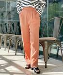トレンドのカラーパンツでおすすめなのがオレンジ。オンにもオフにも使えて、悪目立ちしないまろやかなニュアンスオレンジのサテンワイドパンツが◎。トレンチコートの下に差し込むだけでコーデの鮮度が高まり、春の予感を感じさせる明るい印象に。グリーンのバッグやメッシュサンダルもグッドバランス。