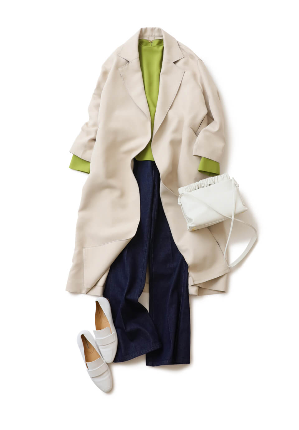 デニムがメインのリラックスデーは、さらりと気軽に着られてサマになるガウン風コートを羽織って大人カジュアルに昇華。バッグ&シューズもコートに合わせてホワイト系で統一することで、優しげな印象に。トップスは、あえてニュートラルカラーではなくくすんだグリーンのブラウスをインして旬を意識して。
