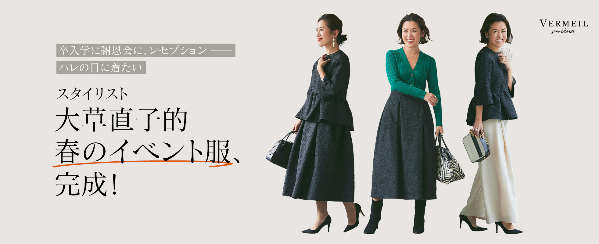 オケージョンアイテムで選ぶべきイエベカラーはベージュやブラウンなどのベーシックカラー。小物はゴールド系がおすすめです。