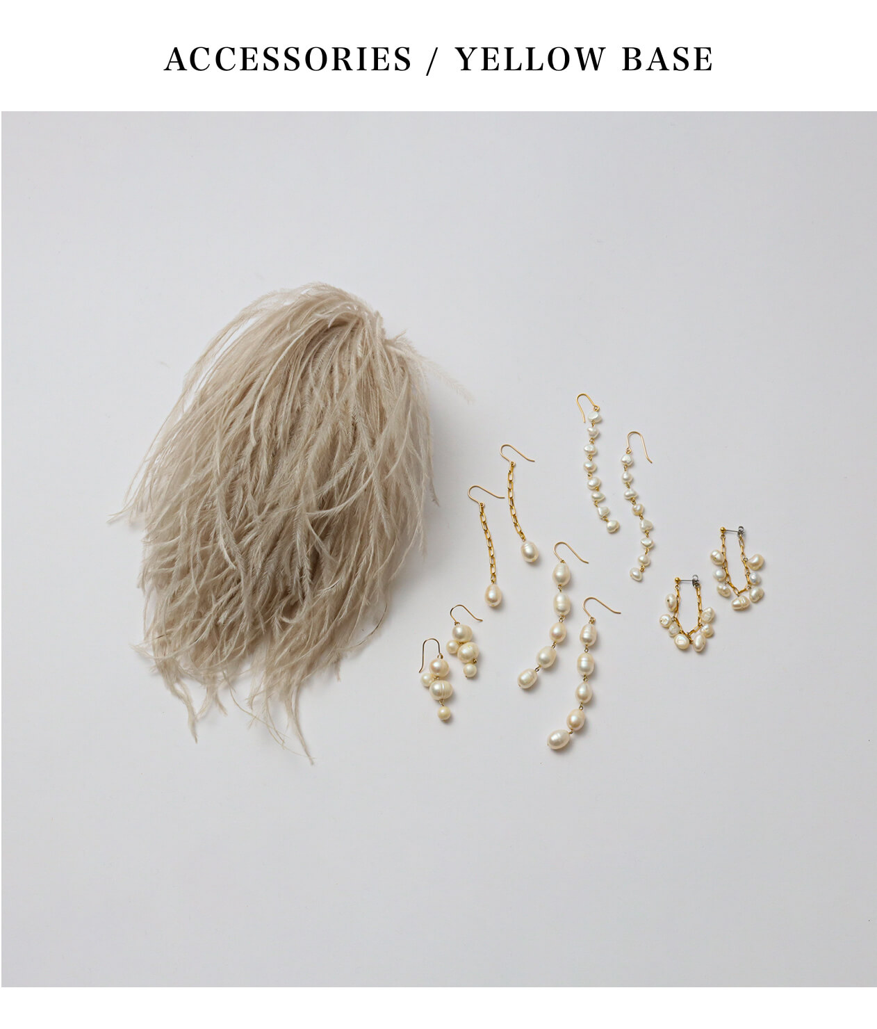 - ゴールド系の小物がおすすめのイエローベース。中でもナチュラルタイプは自然を感じさせるアイテムが得意なので、不揃いのバロックパールやファーなどのアイテムの部分使いがおすすめです。上品に華やぐオーストリッチコサージュは、あるとないとで差がつくワンランク上のアクセサリー。