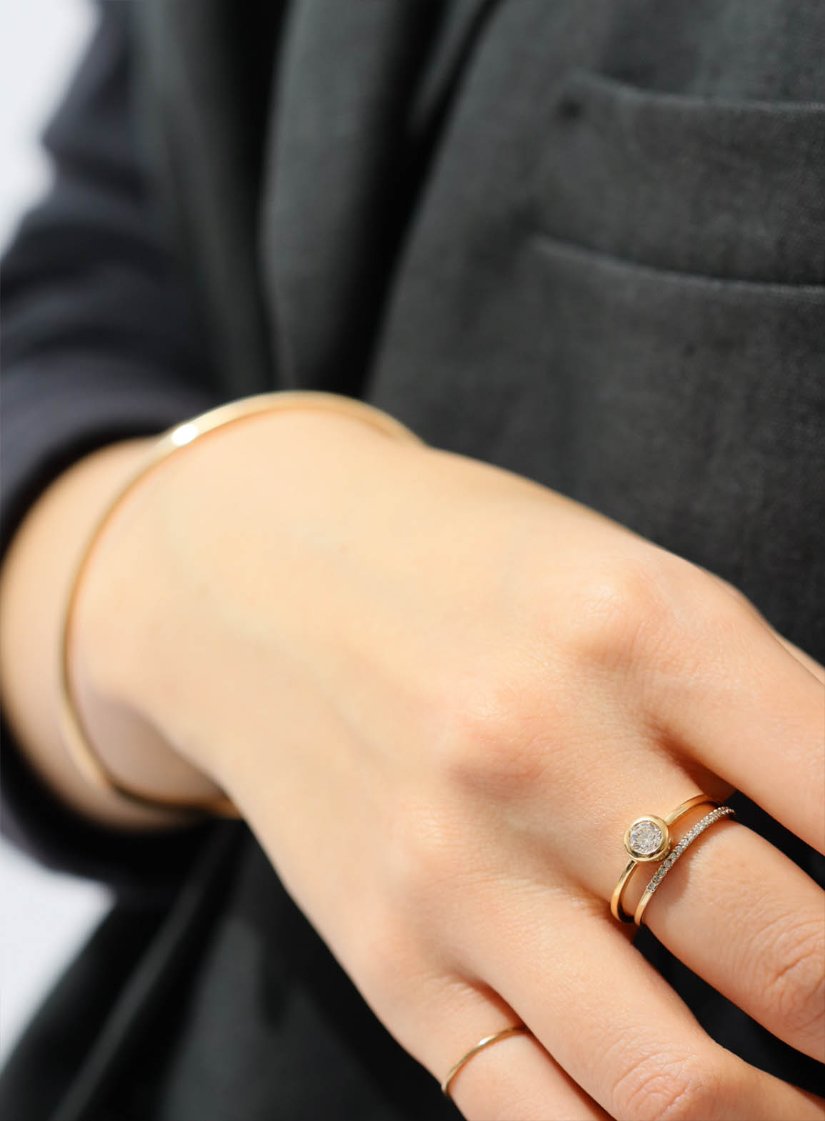 左手の中指のリング、実は5つのリングを重ね付け!是非真似してほしい、レイヤードテクニックです。