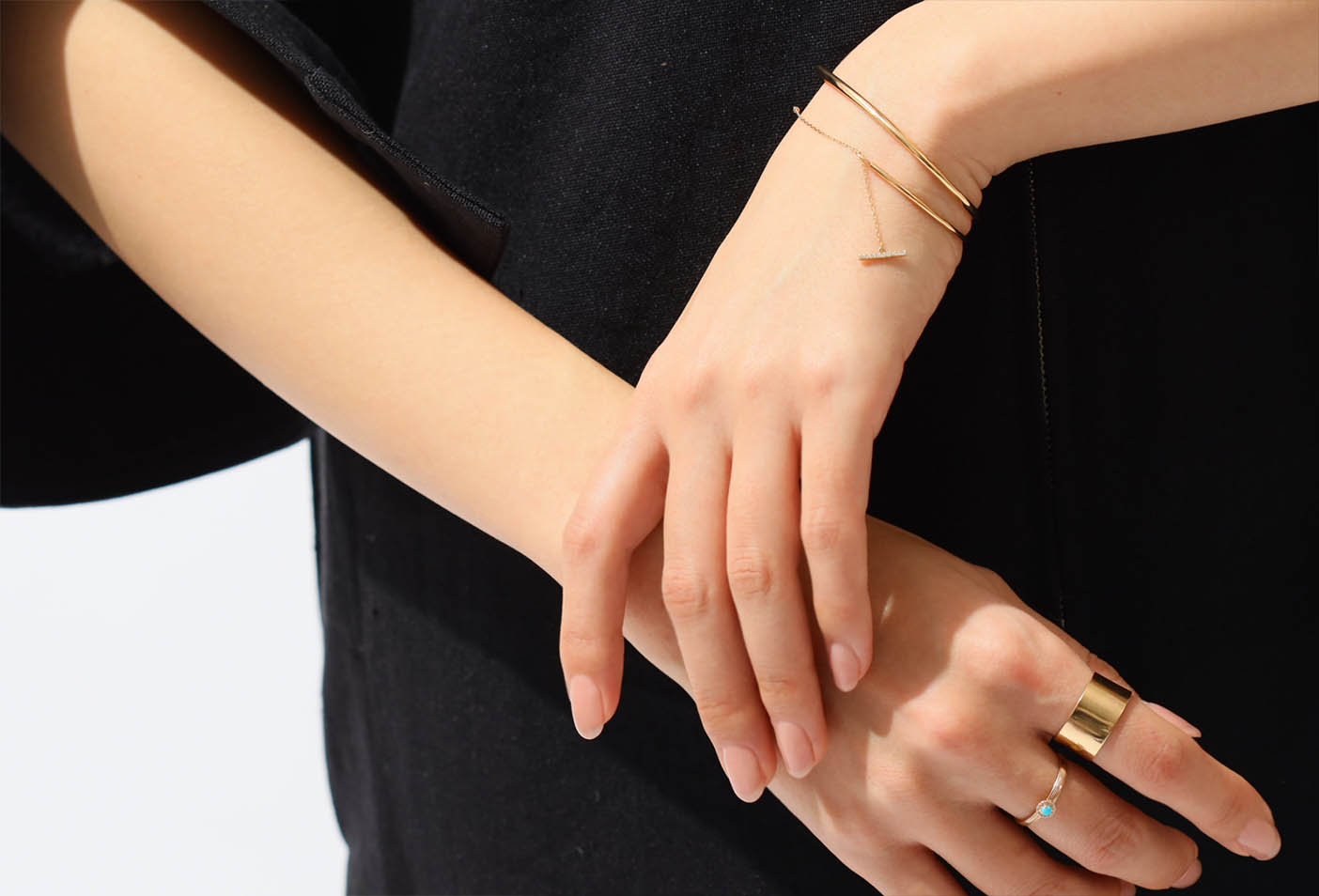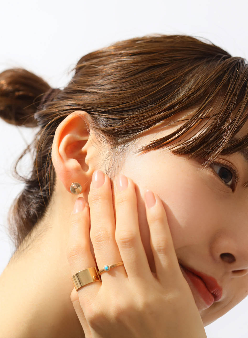 シンプルな定番スタイルなので、サイズ違いで並んだストーンが魅力的なスフィアダブルクオーツリングと、華奢なゴールドジュエリーを重ねて、女性らしい手もとに仕上げました。