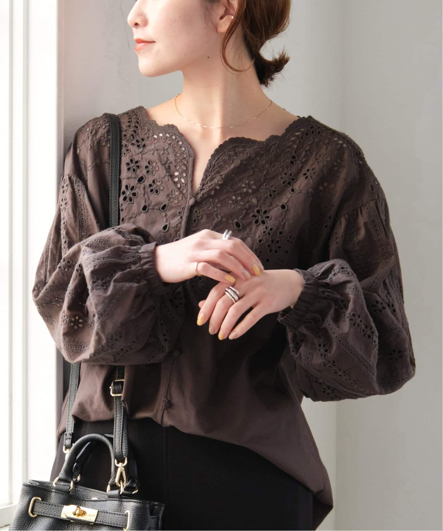 甘すぎない大人ブラウスが続々リリースデコルテのスカラップレースや袖のパフなど、どこかに女っぽいワンポイントを盛り込んだブラウス。でもビターな色味やバンドカラーなどで、大人っぽさはキープ。