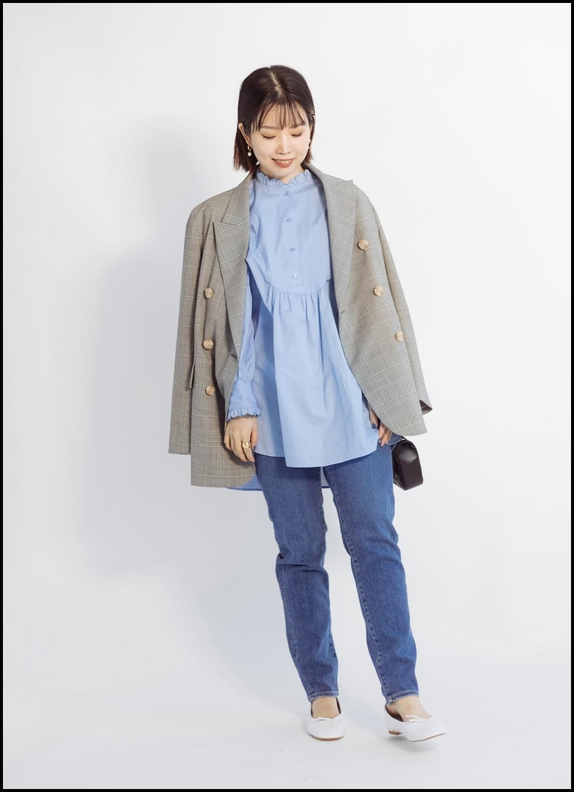 エッジを利かせながらも女性らしさのあるデザインに仕上げました。 ダブルブレストジャケットはどんなシーンにも着やすい 綺麗ですっきりとしたサイズ感。