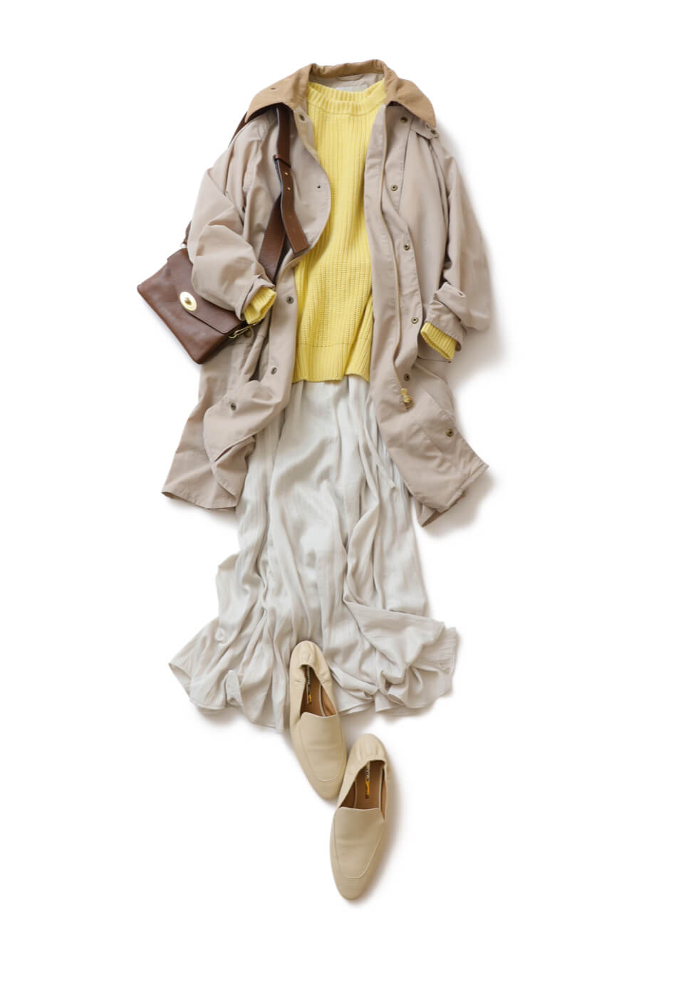 優しげなライトイエローのニットに、ニュアンスのあるシワ感がお洒落なオフ白スカート、ナチュラル色のスリッポン。ニュートラルカラーを中心に組み立てたキレイめコーデで出勤。かっちりしたコートではなく、あえてスポーティーなBarbourを羽織ることで都会的なコーデに更新。