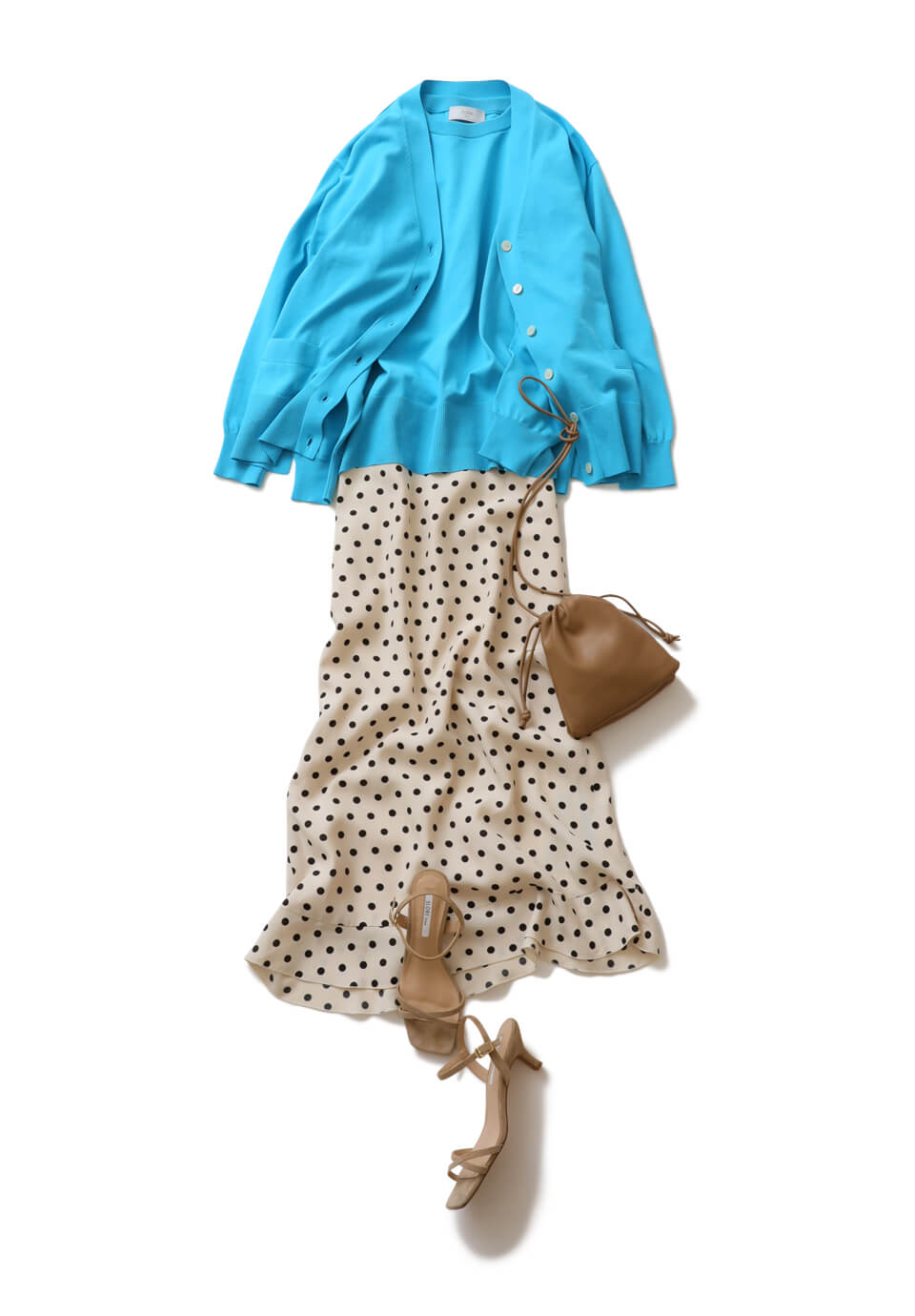 春の行楽デートには、着映えるターコイズ寄りの鮮やかブルーセットアップ。アイスコットンのさらりとした着心地も◎。フレンチシックなドットスカートをつないで、レディな上品さを足し算。トップに色を持ってきた分、小物の巾着バッグとヒールサンダルは馴染ませ色のベージュでまとめるのがベター。
