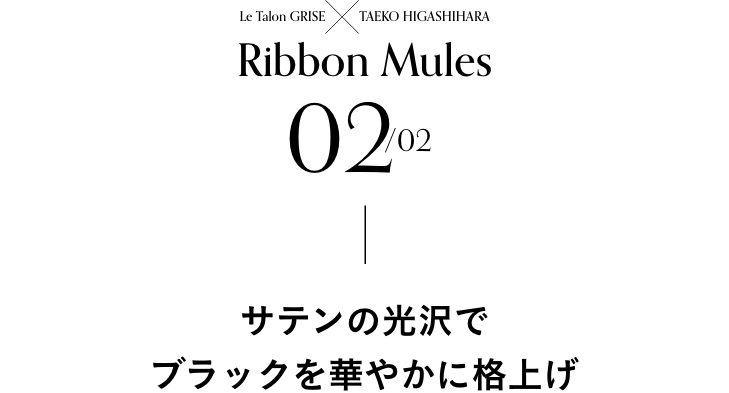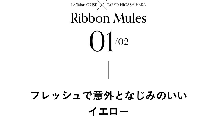 - 「去年、発売後に即完売した大人気のリボンミュールが、今季、定番ブラック&差し色イエローの2色で再登場! 甲のリボンは、可愛さだけでなく、さらっとしがちなスリッパミュールに今っぽいボリュームを加える役割としても。上品な艶感のマットサテンに、シャープな甲のカッティングなど、甘くなりすぎないよう吟味しました。かかとにはゴールドプレートが輝き、履くだけで気分が上がる一足です」
