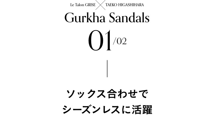 - 「グルカサンダルが便利なのは、春夏だけでなく、ソックス合わせで今の時季から履けるところ。ほんのりモードな存在感で、スカートスタイルを足元から更新してくれます。“ナチュラル”はパキっと眩しい白ではなく肌になじむクリーミーな色だから、メンズライクなグルカデザインも女性らしく履けるはず」