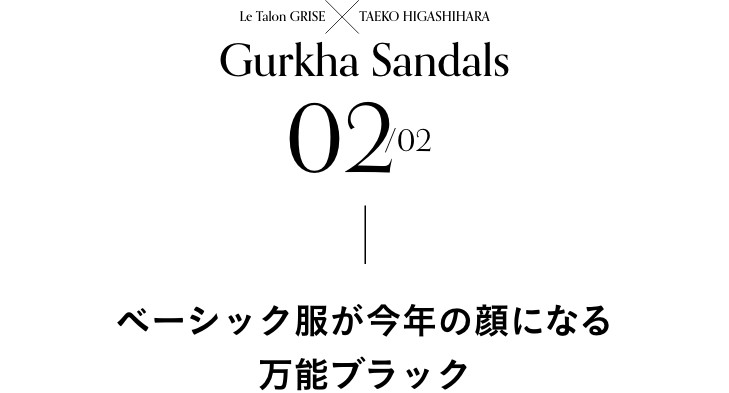 - 「毎シーズン真っ先にアップデートするのが、一番登場するブラックの靴。今季は、旬のグルカサンダルを。今っぽいボリュームの厚底も、重すぎず大人がきれいな印象ではけるデザイン。パンツともスカートとも相性がよく、グルカならではのベルト使いと光沢素材が着こなしのアクセントになってくれます」