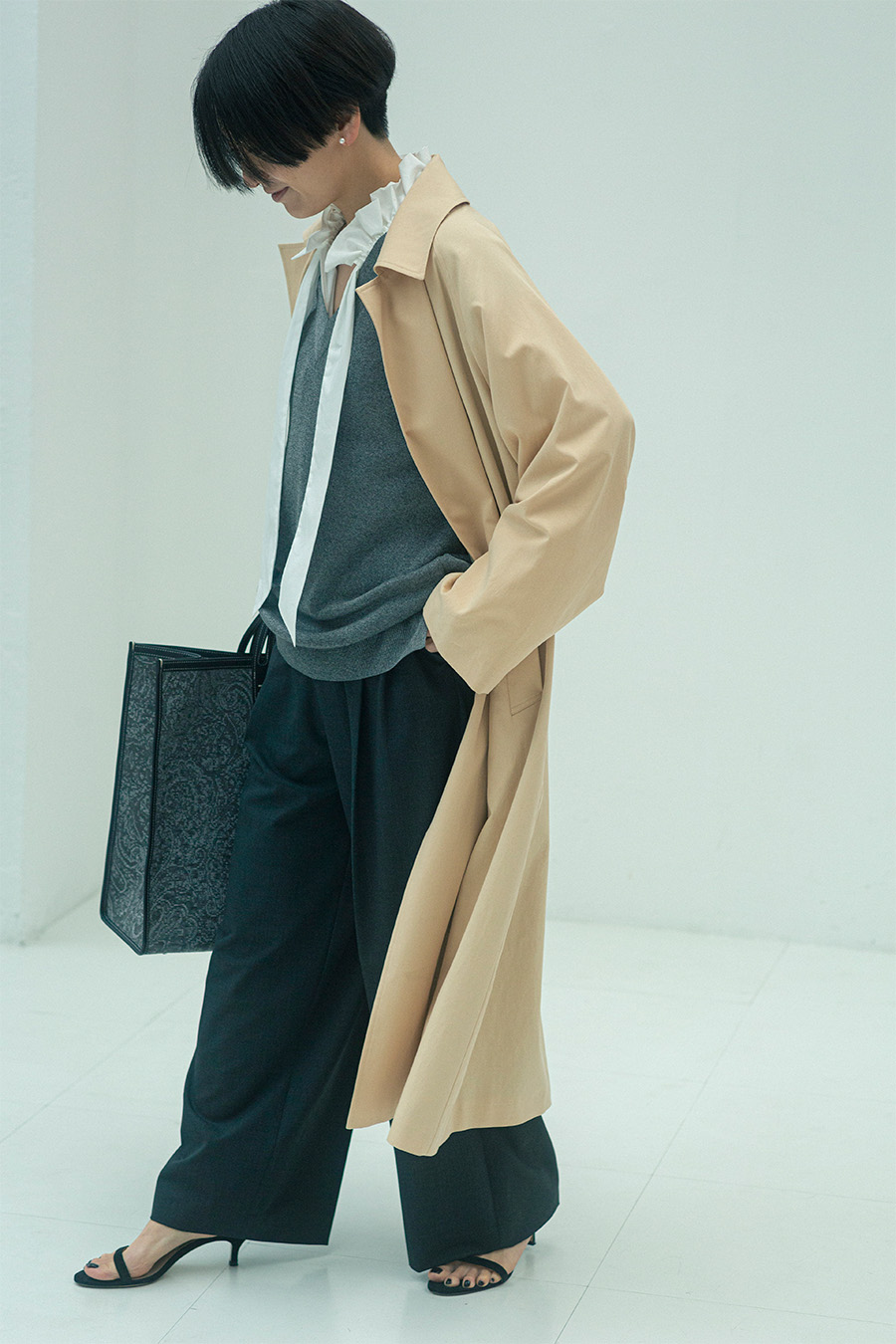 計算されたサイジングによってバサっと羽織るだけでサマになる優秀コート。ボタンもベルトもないシンプルな着流しデザインが新鮮です。中の組み合わせによって見え方が変わる絶妙な色味も洒落ています。何にでも合う馴染みの良いベージュでありながら、グレーのグラデーションを合わせるとカラーコートのようにイエローが際立って素敵です。