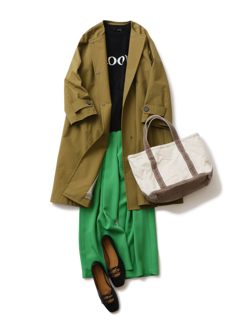 今年の春はカラーアイテムが大豊作。大人っぽく知的に華やぐグリーンは今季もキーカラーになりそう。ワイドなキュロットシルエットがキャッチーなグリーンパンツは、一点投入で春らしく着映えるアイテム。メンズライクな黒のロゴトップスとカーキコート、カジュアルトートを合わせてラフに仕上げるのがコツ。