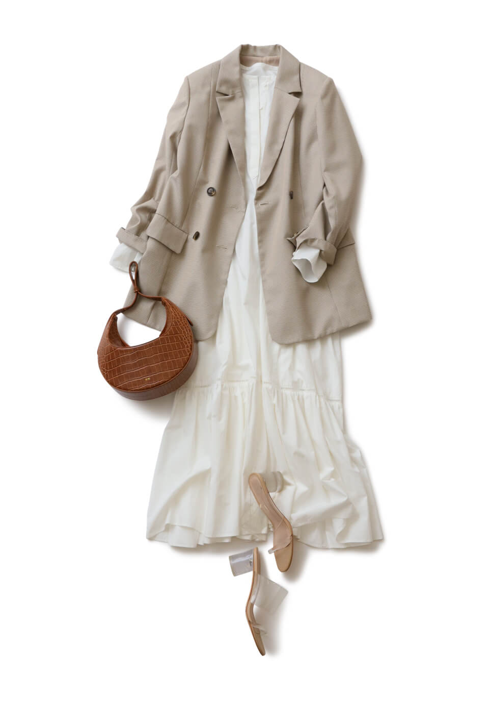 一枚でサマになるティアードワンピースは、詰まったネックラインやはしごレースのディテールが甘すぎず大人にちょうどいいデザイン。キチンと感もしっかり漂うから、ジャケットを羽織ってオンのコーデに取り入れて。合わせるアイテムをベージュや茶系でまとめることで、優しく馴染んで上品な雰囲気に。