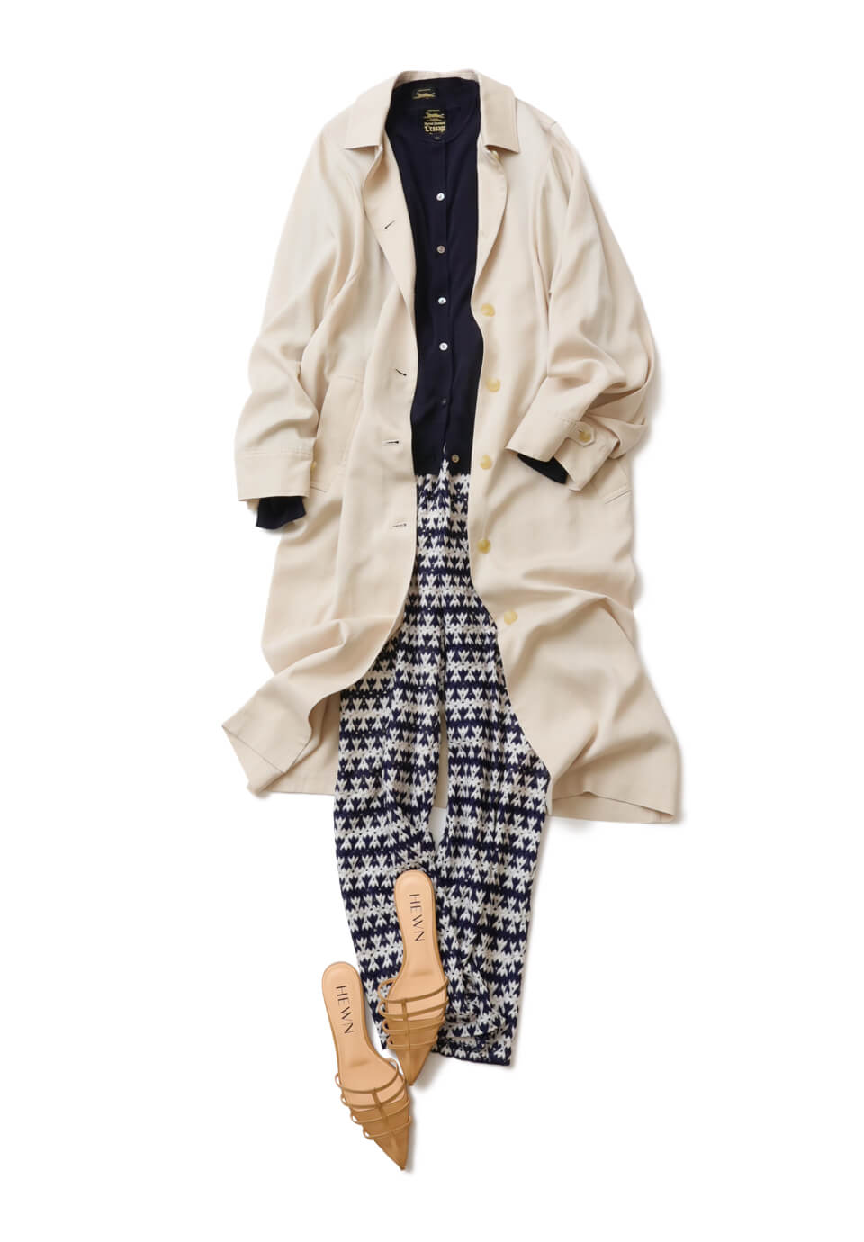 体のラインを拾わないストレートシルエットのレースパンツは、甘さよりもモダンな印象を引き寄せる大人女子にぴったりな一着。ブラックのアンサンブルとつないで、気取らない上品コーデに。ワンピースとしても着回せるコートをさらりと羽織って、華奢見えサンダルで抜け感をプラス。