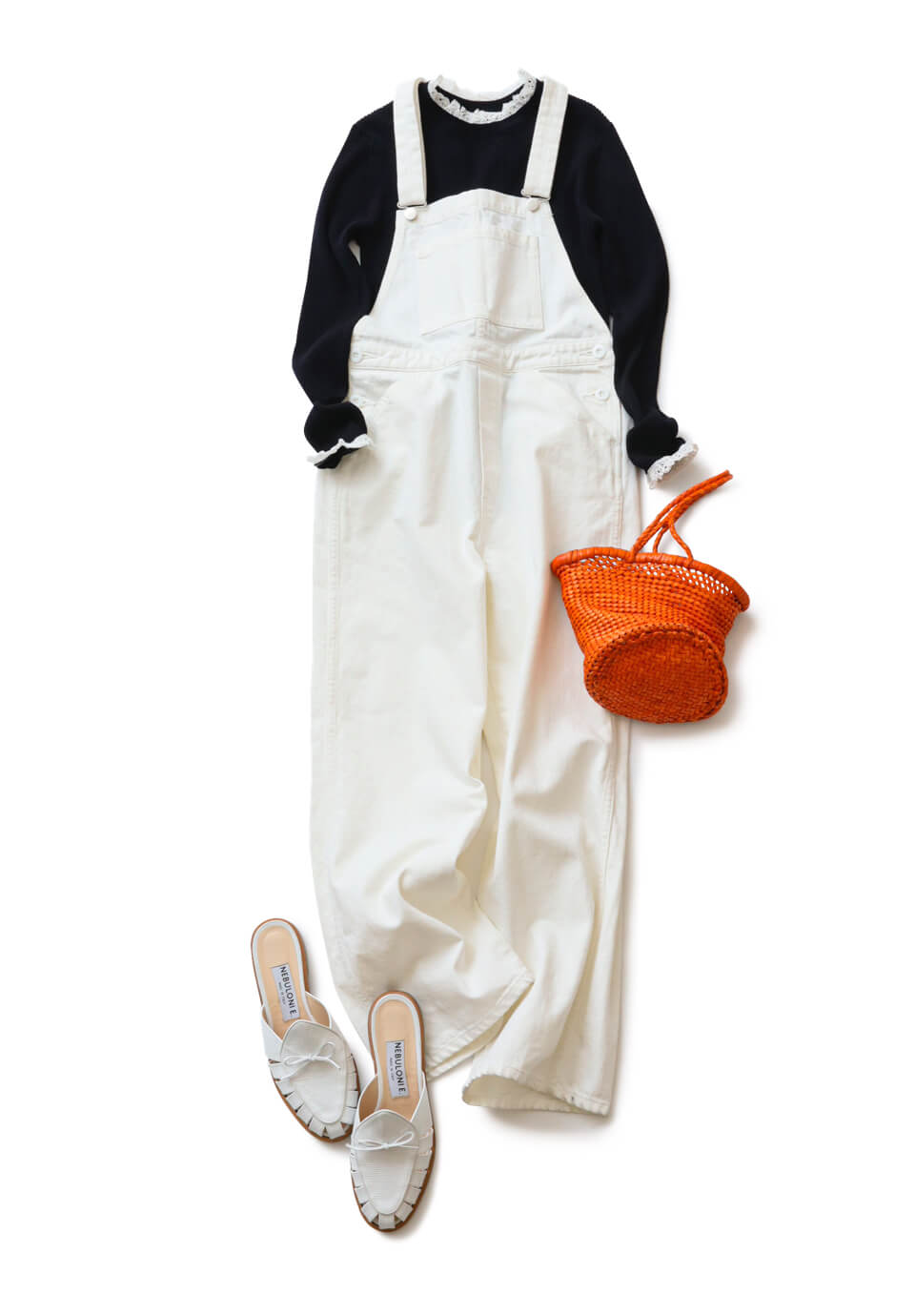 クリーンなホワイトのデニムサロペットをゆるっと着こなす春カジュアル。ネイビーのリブプルオーバーをインして、膨張見えを防いで。襟と袖にあしらわれたレースが大人可愛いアクセント。今季注目のチアフルなオレンジのメッシュバッグで、さらにトレンドムードを高めて。