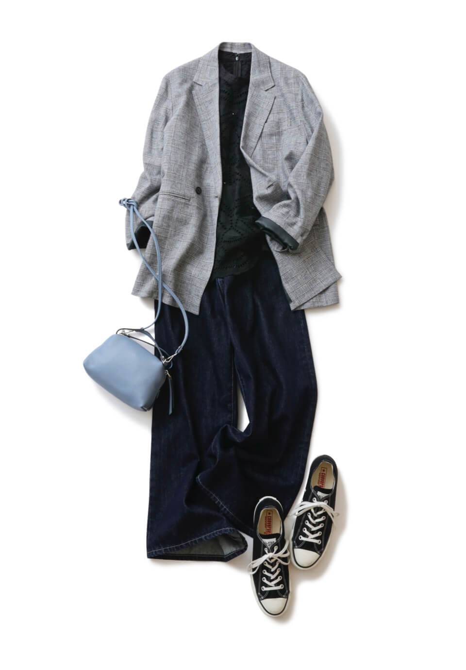 清涼感のある素材とグレーの色味がクールなジャケットは、これから夏前まで活躍するさらっとした着心地の良さも◎。黒のカットワークレースブラウスとタック入りワイドデニム、どちらもこの春トレンドのアイテムをMIXして感度を高めて。コンバースのオールスターがジャケットコーデをさらに軽快に。