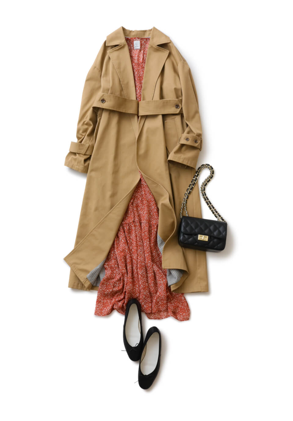週一の出勤日は、一点投入で着映えてキレイめに仕上がるワンピースを潔く一枚で。控えめな小花柄が大人っぽく、ふんわりとギャザーを寄せた盛り袖や揺れるシルエットが魅力。高めのウエスト位置がスタイルアップも叶う、ボリュームコートともグッドバランス。