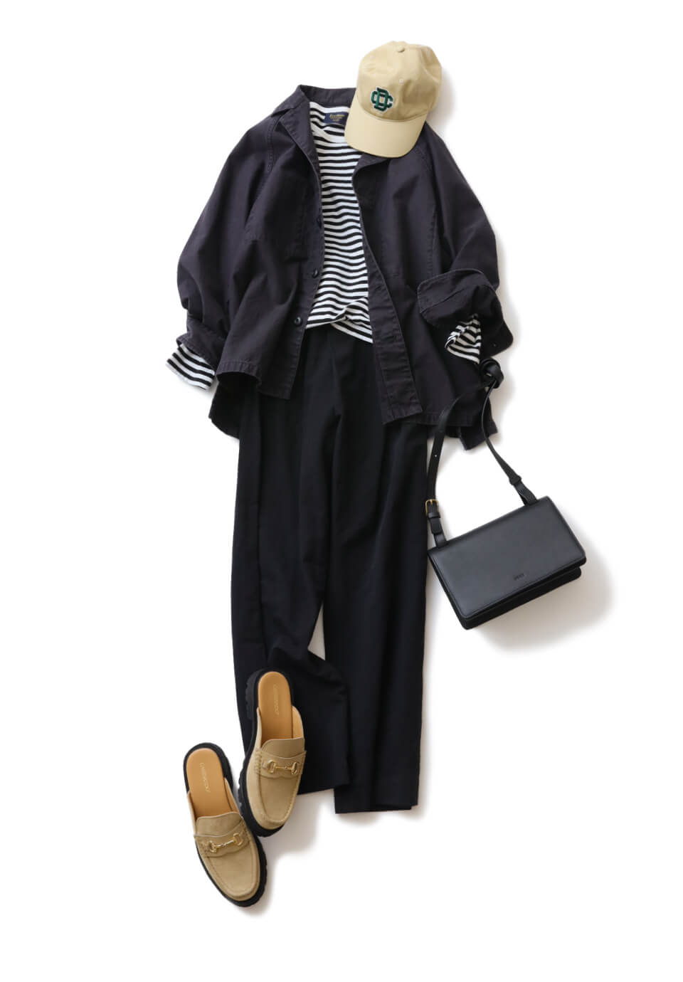 単品でもレイヤードでも使い勝手の良いLE MINORのボータートップスに、黒パンツ&アーミーシャツジャケットを合わせたモノトーンカジュアル。装飾を排したミニマルなショルダーバッグも、ブラックでシックに大人顔。厚底ソールのローファーやスポーティーなキャップがスタイリッシュさをさらに上乗せ。