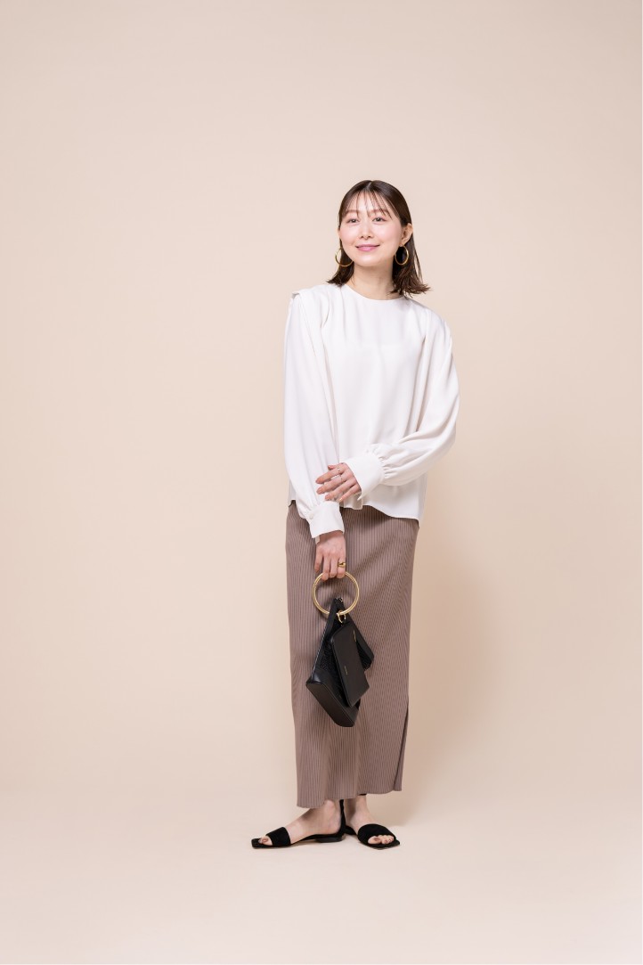 とろみ素材×パワーショルダーザインで今年らしさを詰め込んだブラウス。