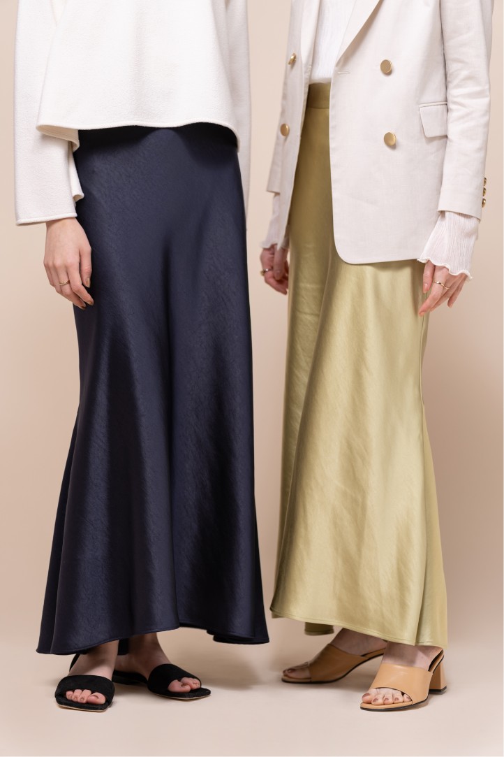 サテンのとろみ感を生かしたナローラインのロングスカート。裾に向って作り出される流れるようなドレープが、女性らしさを高めてくれるキーポイント。バイヤス取りしたことでヒップ周りはタイトに、バックスタイルは切り替えを入れる事で上品なフレアシルエットに。360°どこから見ても女性らしく美しいラインをアピールできる1枚。 - NOBLEサテンハイウエストマーメイドスカート◆¥17,600(税込)