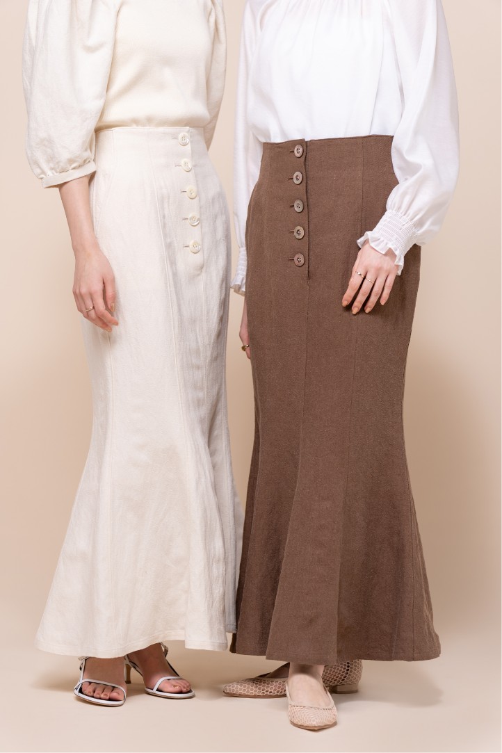 素材はローシルクで、通常のシルクのようなつるつる感を軽減し春先にピッタリな一枚。通気性も良いので、夏まで快適な穿き心地を堪能できます。ほんのり腰回りを絞ったハイウエストでトップスインも好バランス。ナチュラルな風合いに馴染む、フロントのシェルボタンもアクセントとして効いています。 - NOBLEシルク混ノイルマーメイドスカート◆¥20,900(税込)