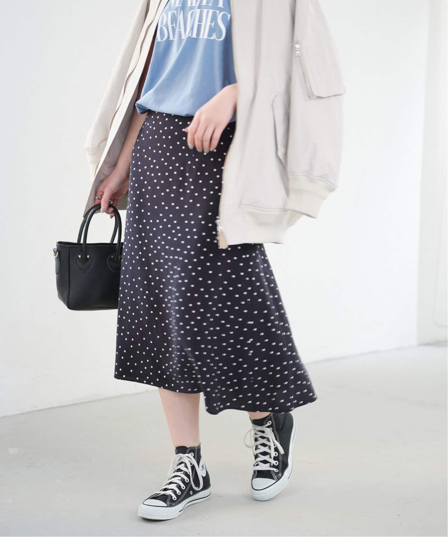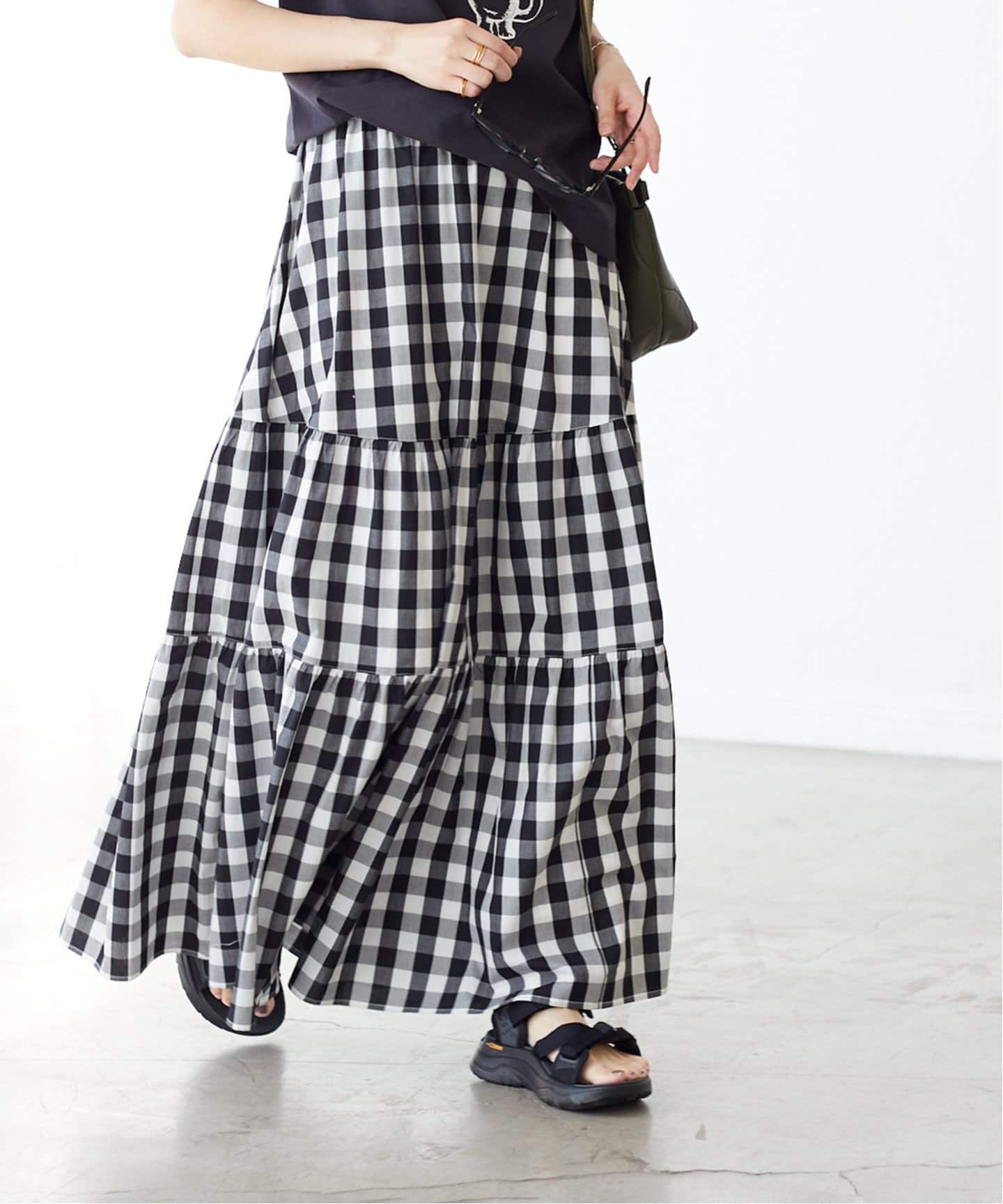 照れずに着られる大人な柄スカートSLOBE IENAのおすすめは、シンプルなワンツーコーデがぐっと見違える柄物スカート。モノトーンのギンガムチェックやネイビーのドット柄なら大人カジュアルと好相性。