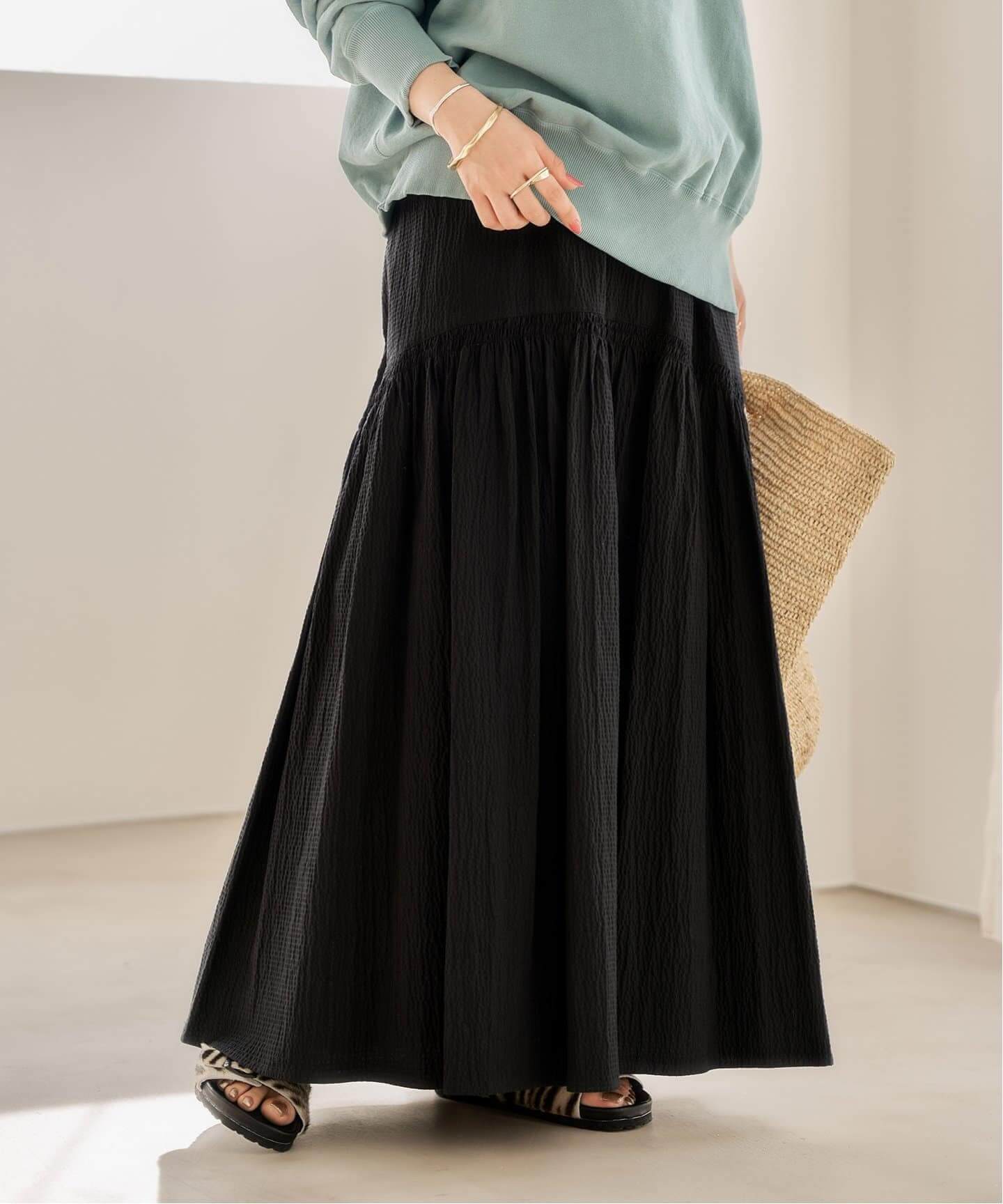 大人リラクシーな旬ボトムスハンサム派さんにおすすめなのがJOURNAL STANDARDのスカート。プリーツ&ティアードは敬遠しがちだけど、こっくりした黒が甘さを軽減してグッドバランスに着地。
