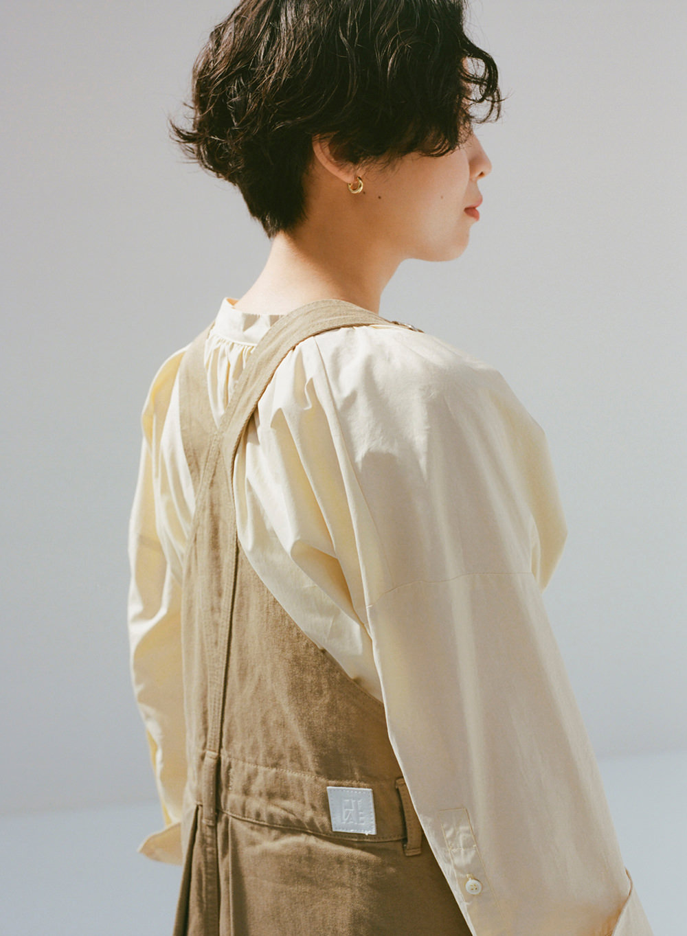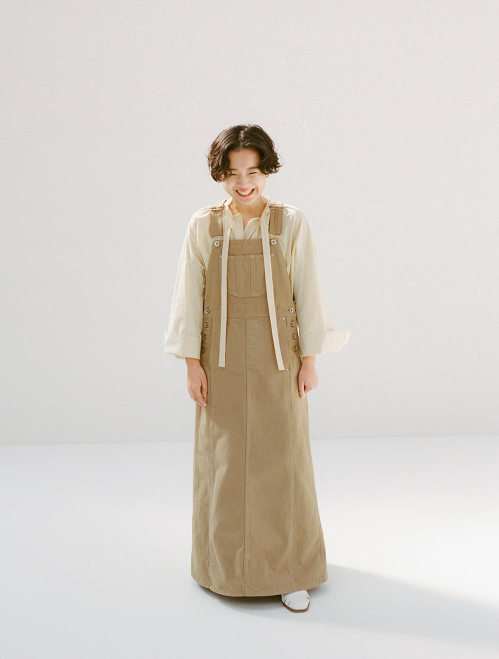 ヴィンテージの良さを活かしながら現代風にアレンジされたオーバオールスカート。フルレングスの丈とシルバーのパーツがモードでクリーンな印象に。合わせるトップスで何パターンも表情を変える一着。