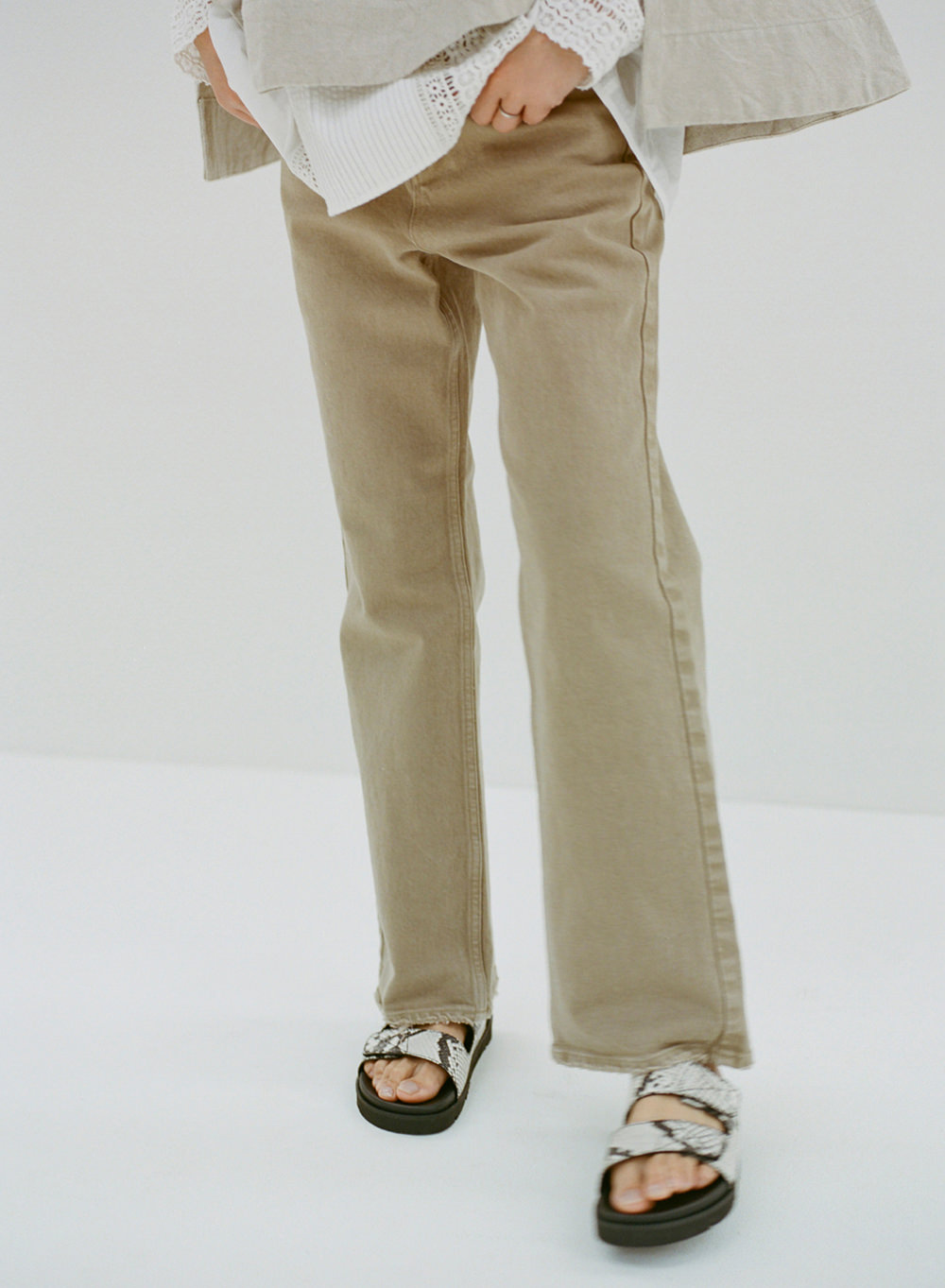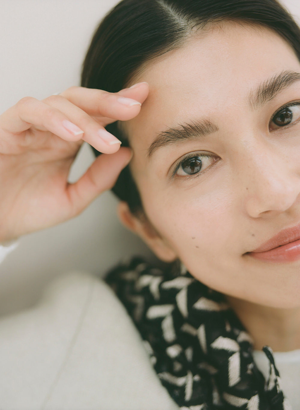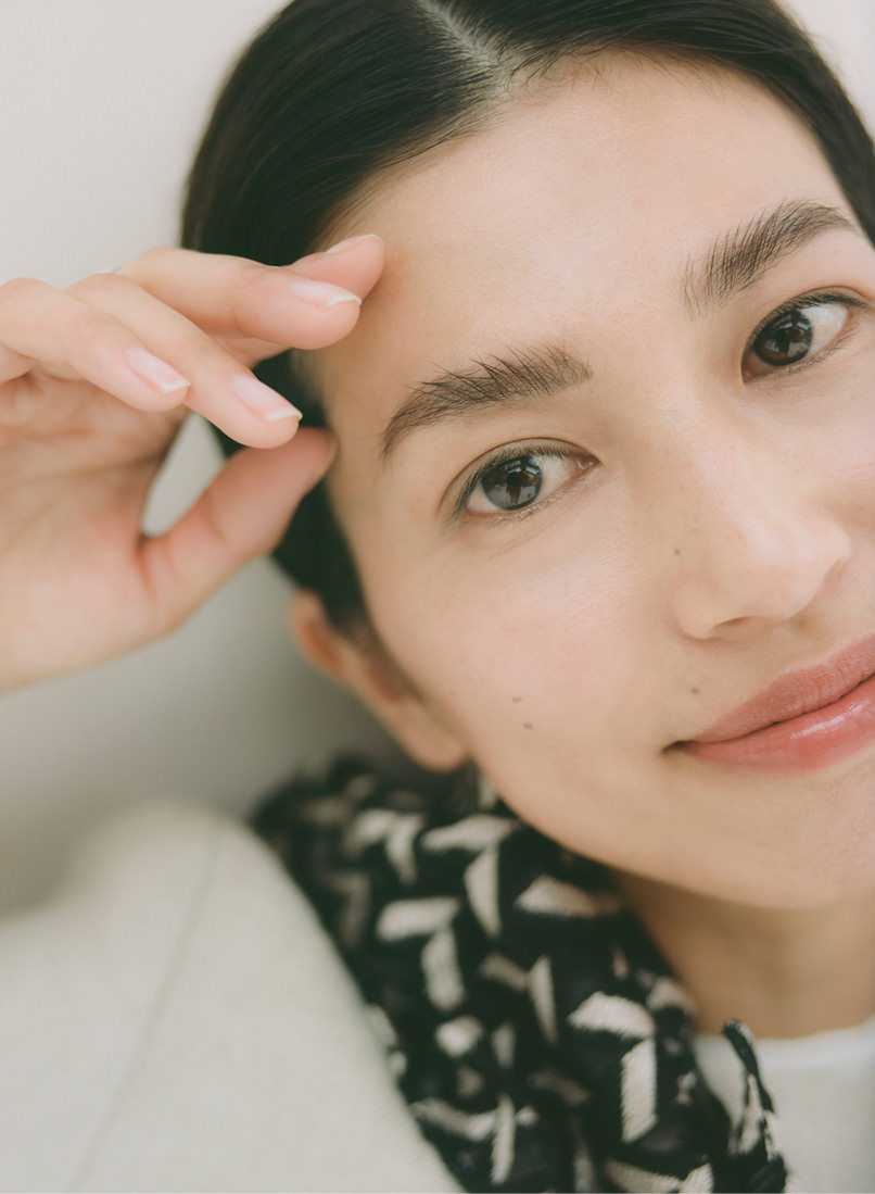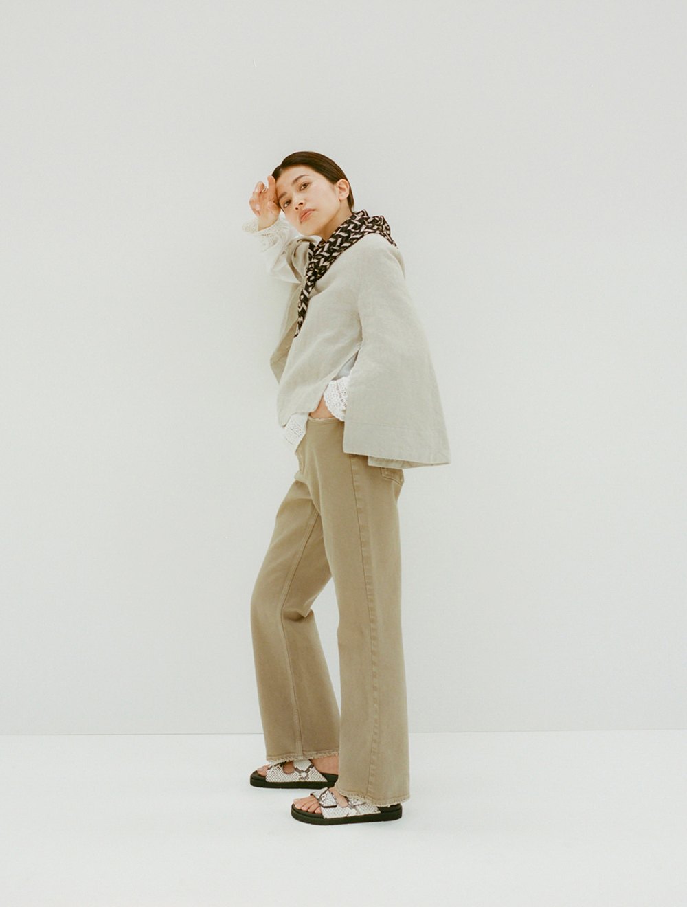 IÉNAとupper hightsが一から作ったハイウエストかつセミフレアシルエットのパンツ。カラーは今年トレンドのドライ感のあるベージュを選択。優しいニュアンスカラーでまとめたコーディネートのポイントには、女性の強さが感じられる眉メイクを。