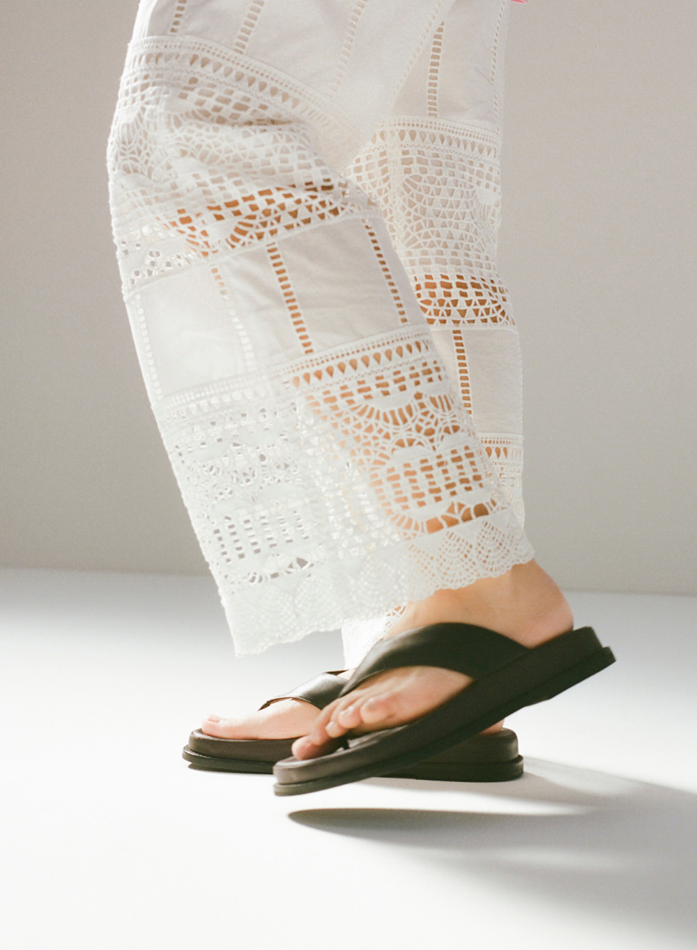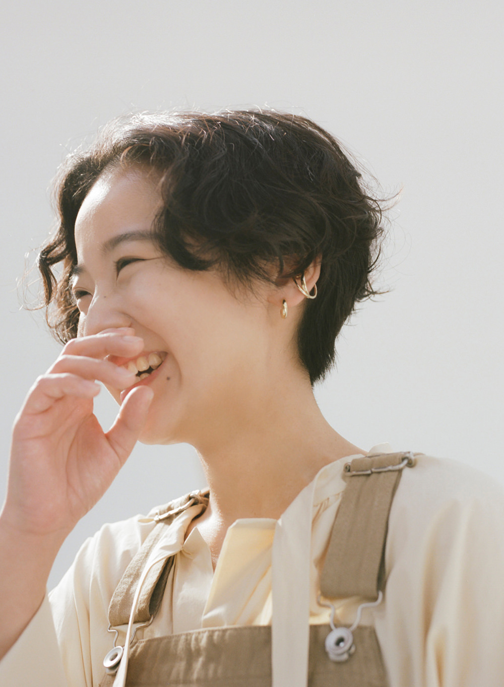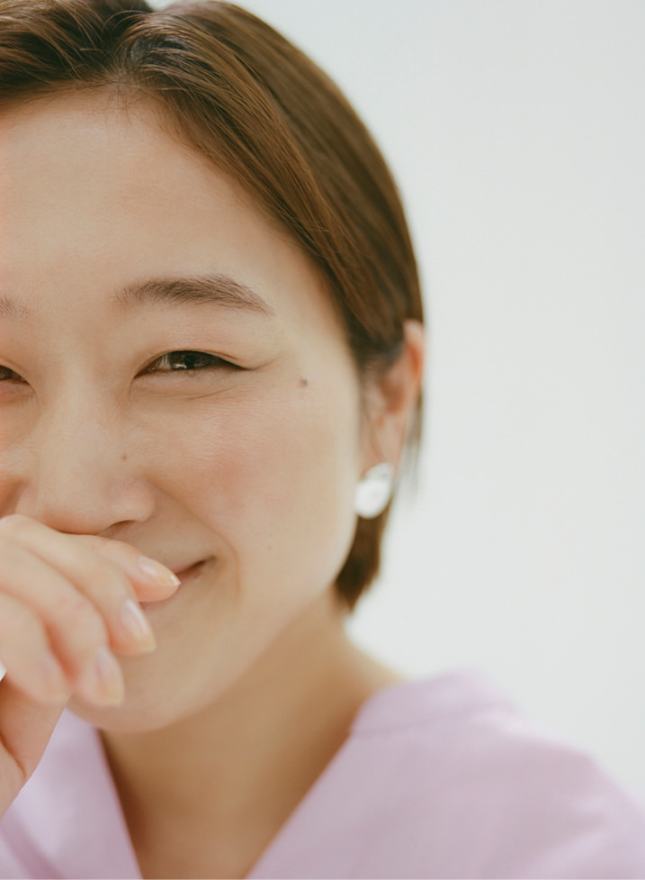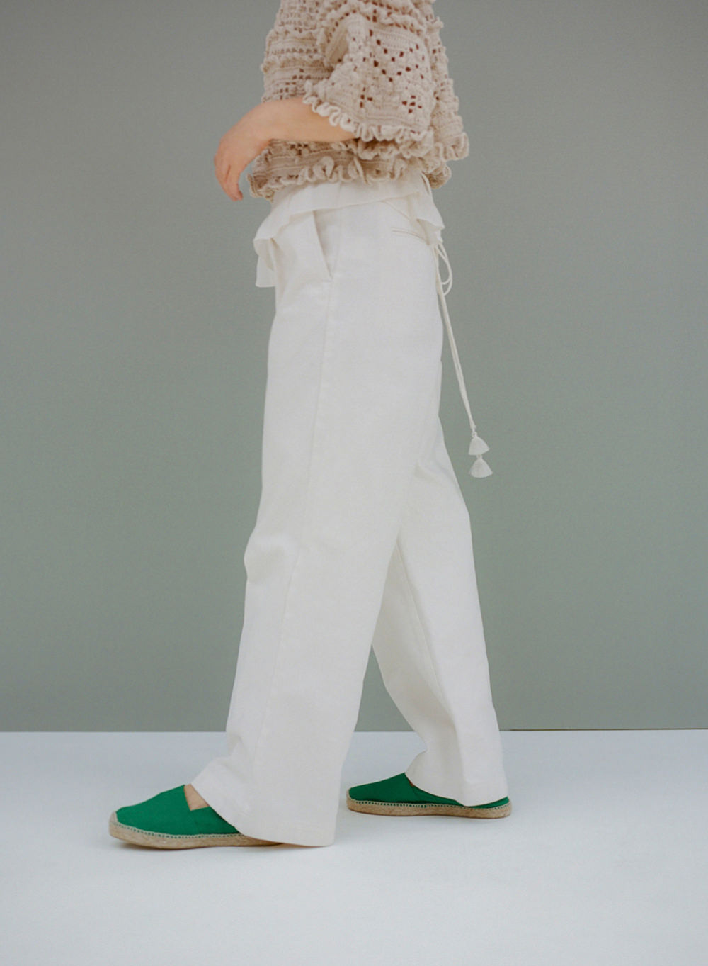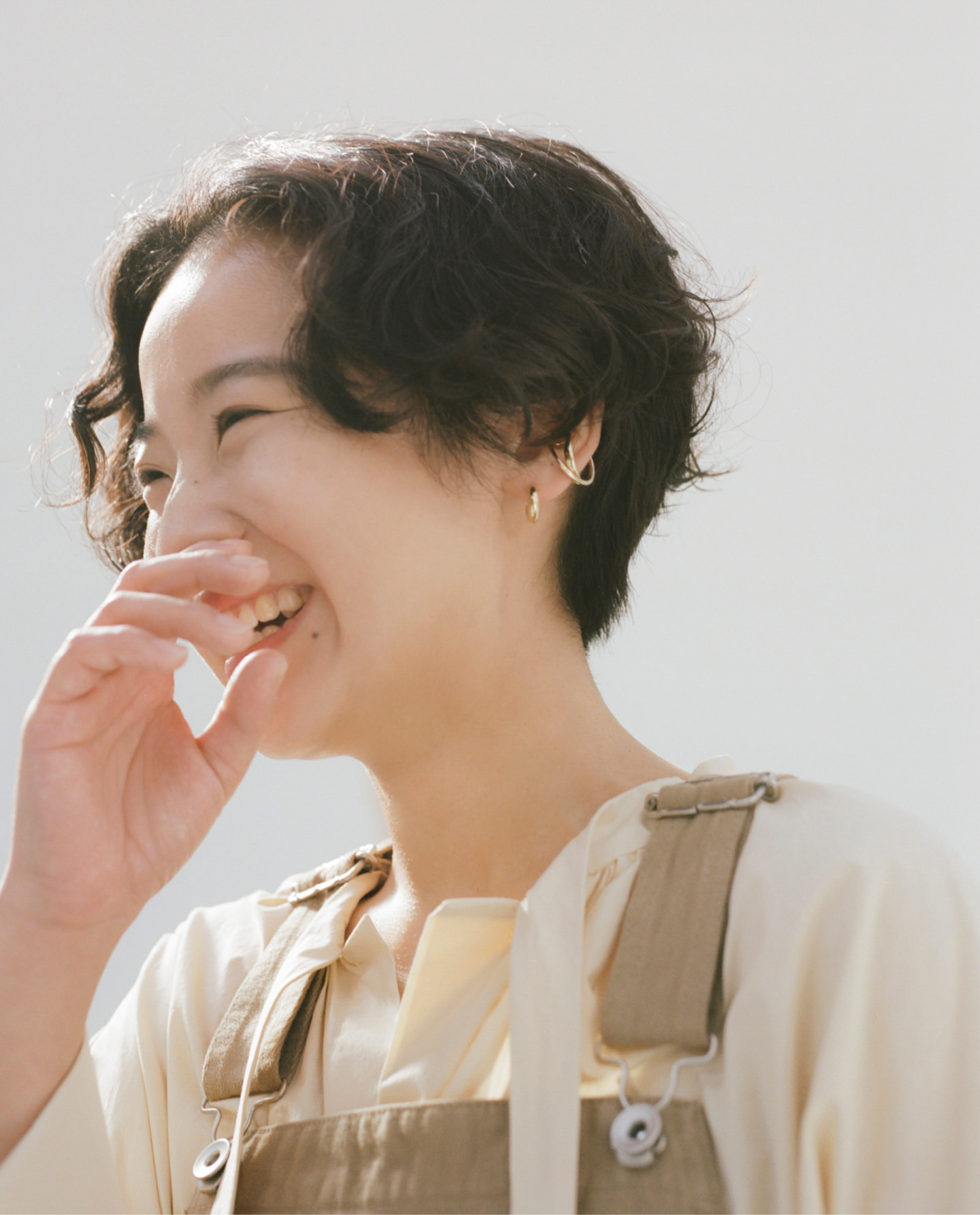 IÉNAとupper hightsが一から作ったハイウエストかつセミフレアシルエットのパンツ。カラーは今年トレンドのドライ感のあるベージュを選択。優しいニュアンスカラーでまとめたコーディネートのポイントには、女性の強さが感じられる眉メイクを。