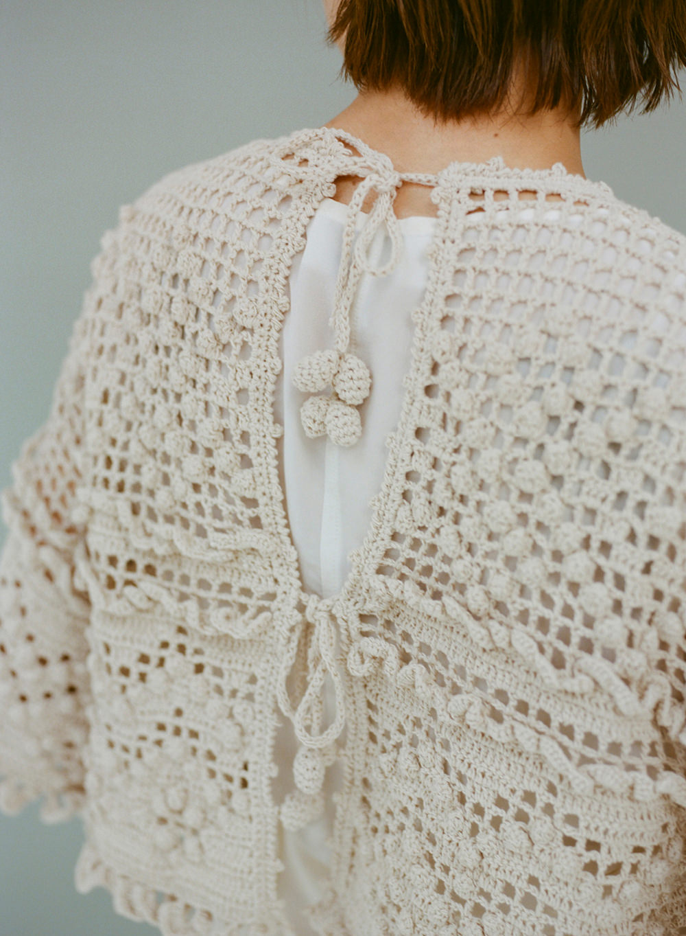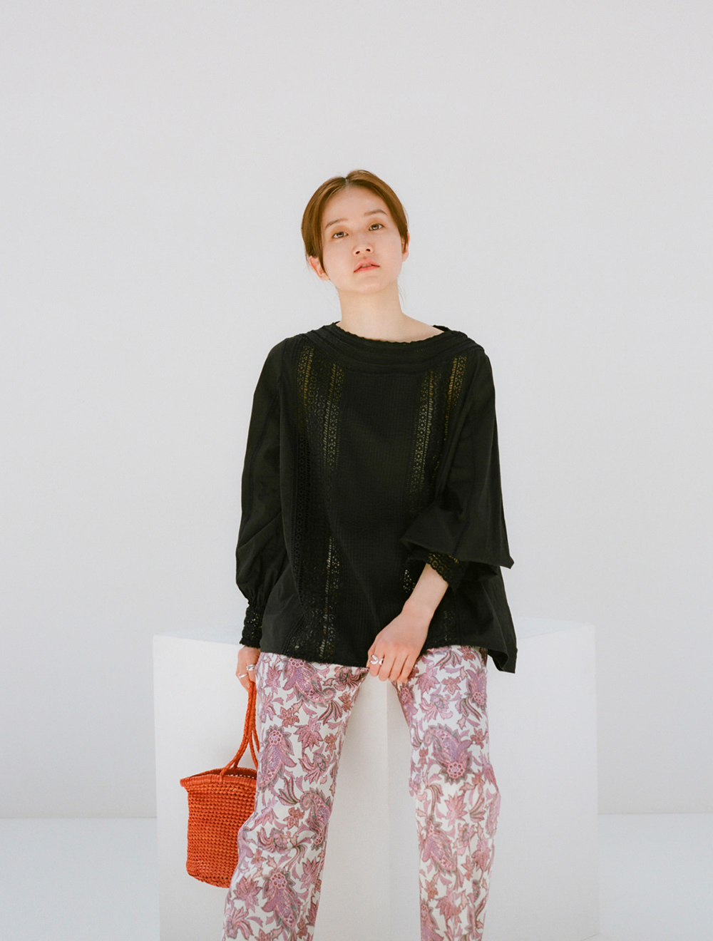 レースは甘さを出すものではなく、甘いスパイスを加えるもの。ボリューム袖の内側に細いゴムが入った仕様で、袖をまくった時にしっかり止まる。着方を自由自在に楽しめるおとなのためのレースブラウス。