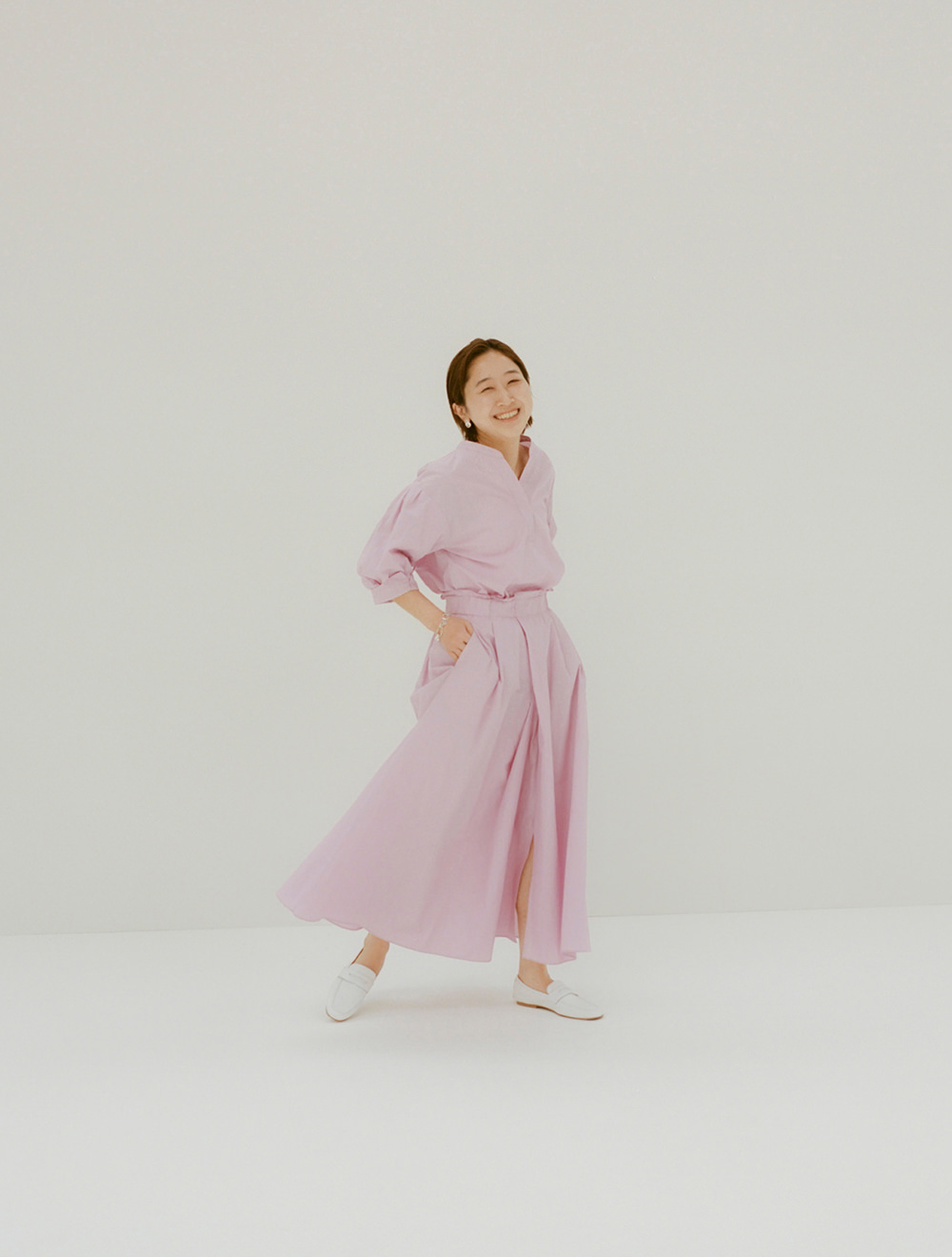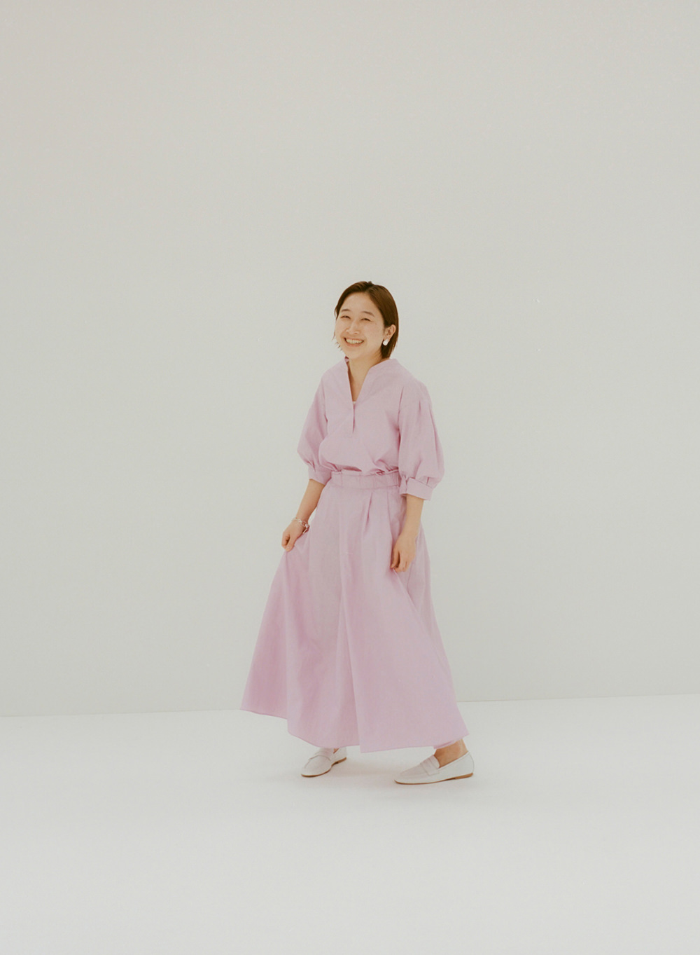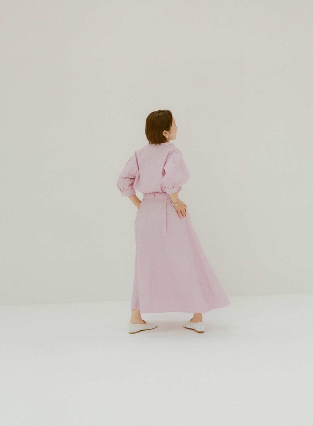 シャツ素材のブラウスとスカートのセットアップ。それぞれさりげないディティールのこだわりが感じられるデザイン。セットアップを着るといつでも晴れやかな気持ちになる。自分の心は自分で整えることがMy style。