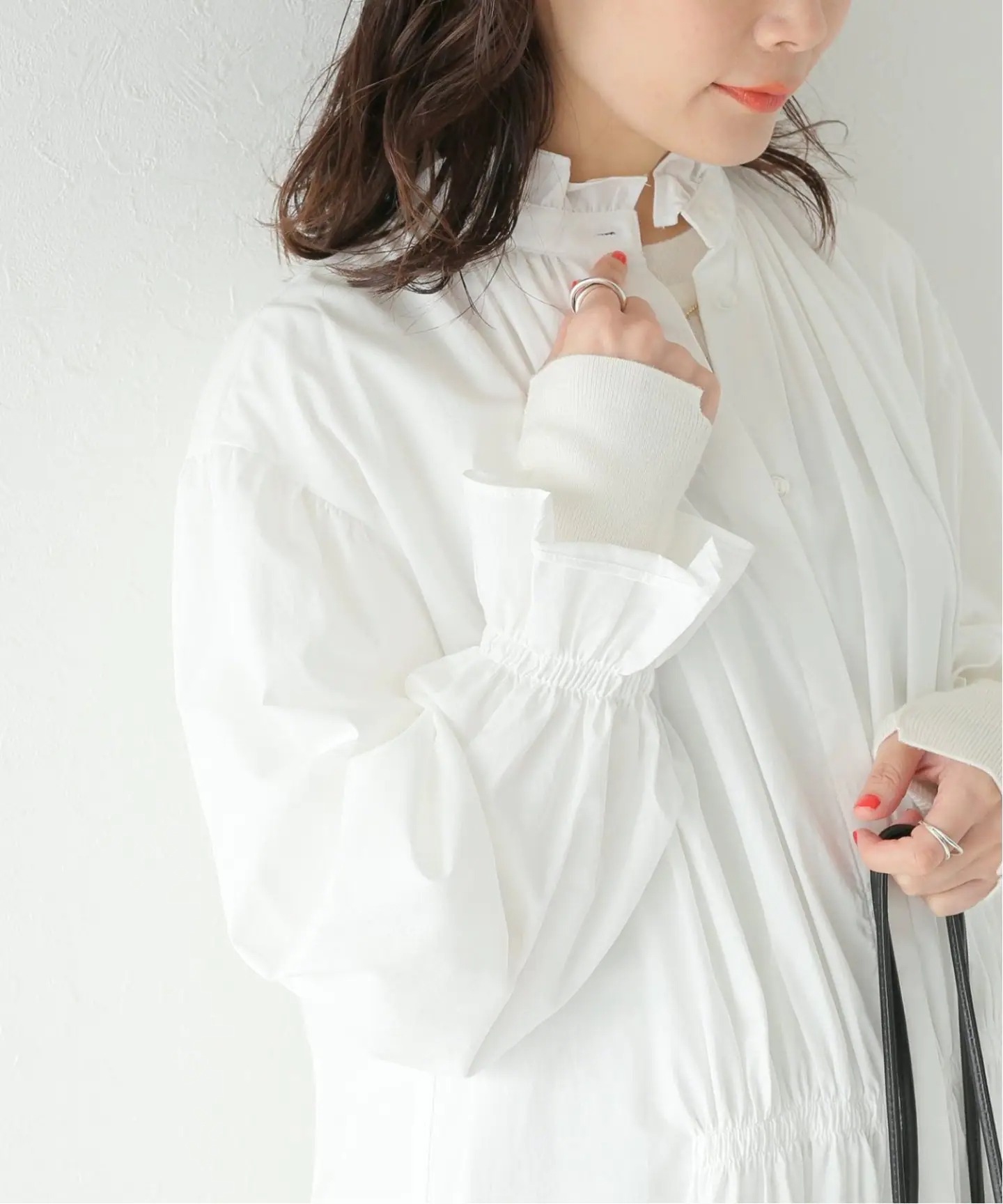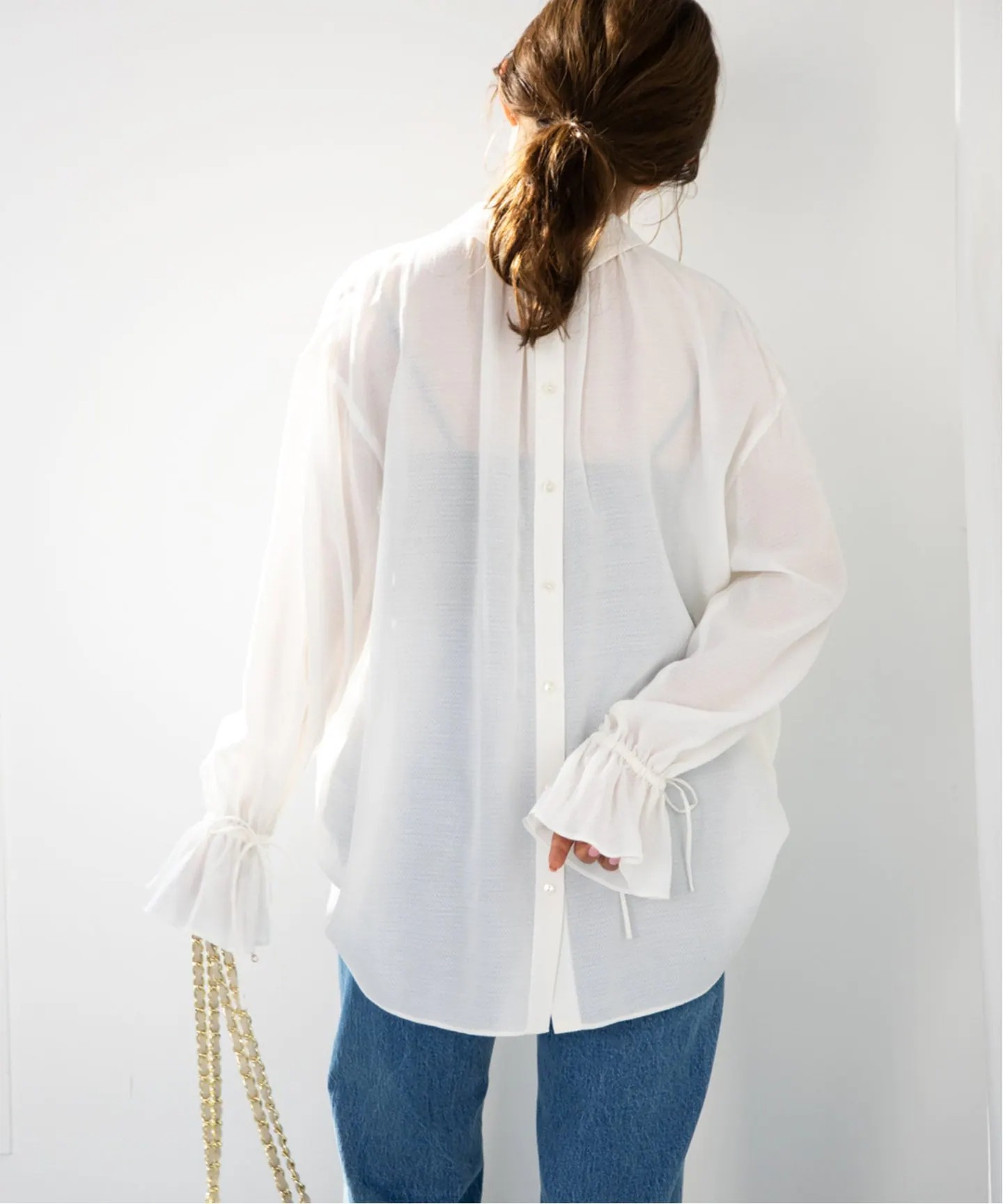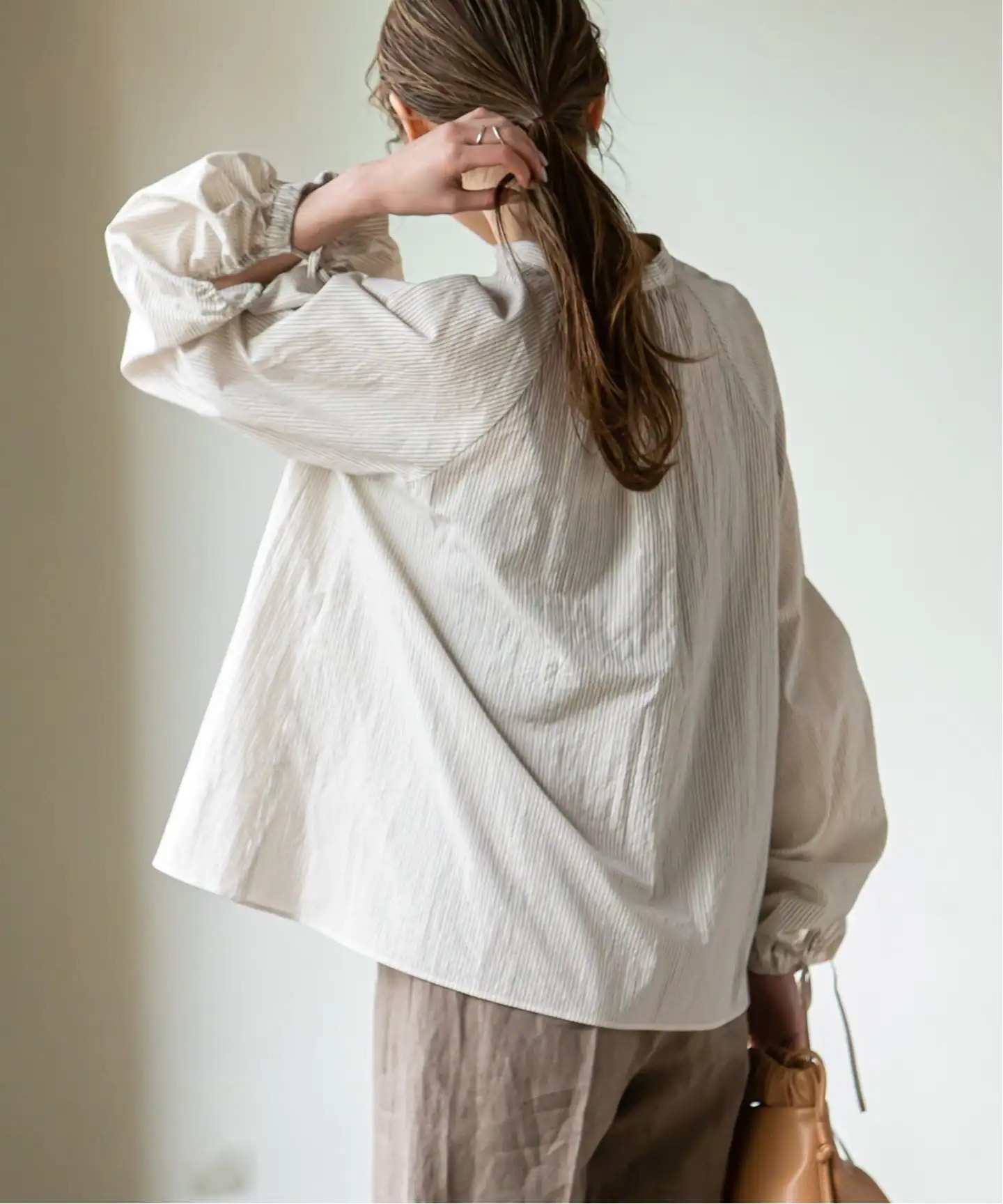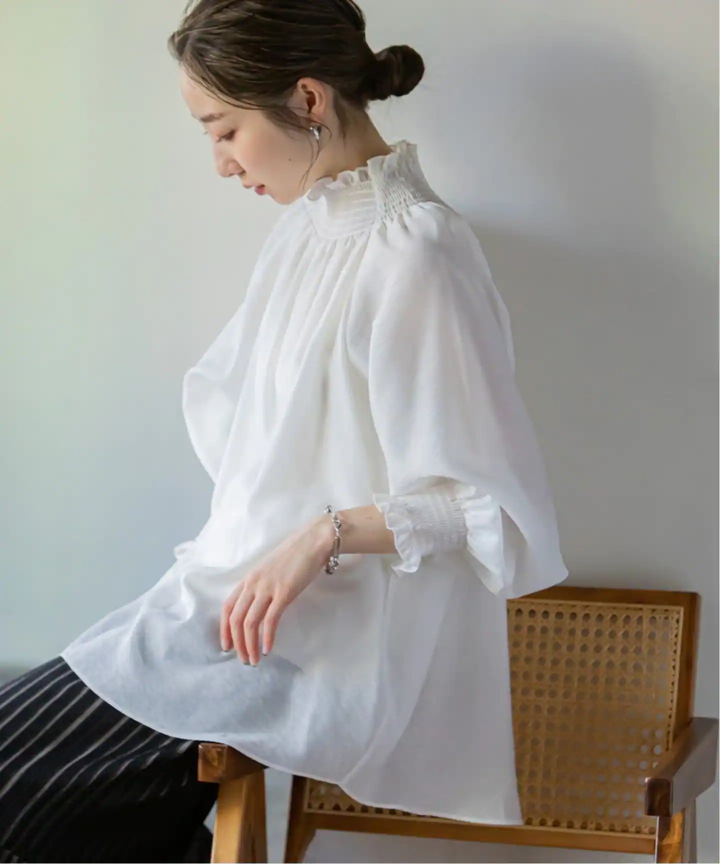 一枚あると重宝するボリューム袖ブラウスノーカラーなどのミニマルなフロントに対して、ふんわり華麗にフレアが広がるボリューム袖。シンプルコーデでもぐっと洒落見えするから、1枚あると便利なデザイン。