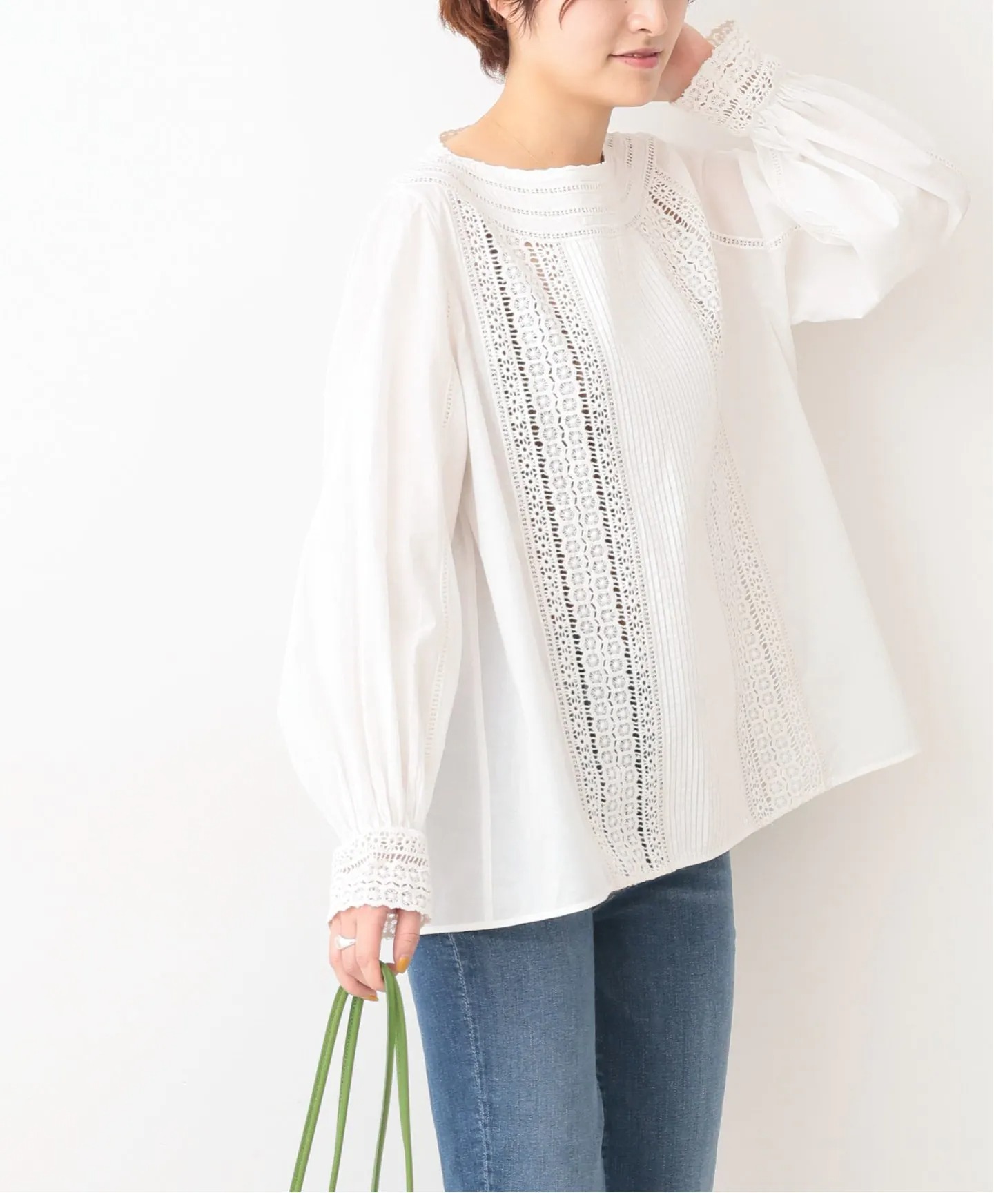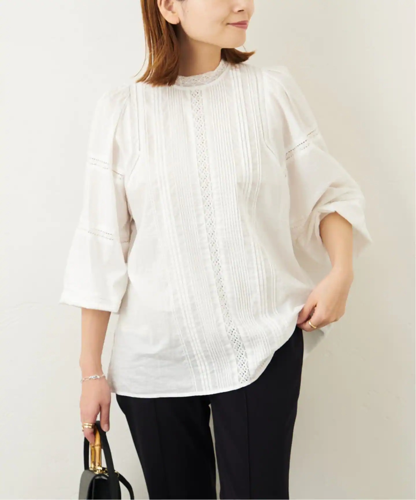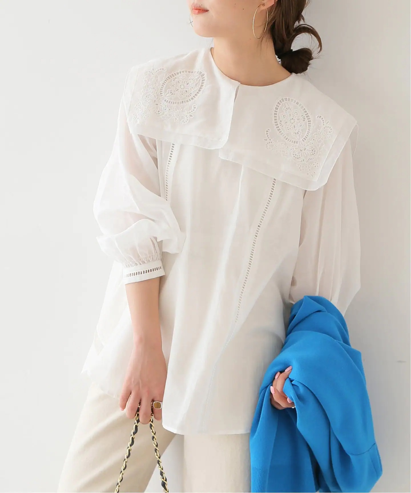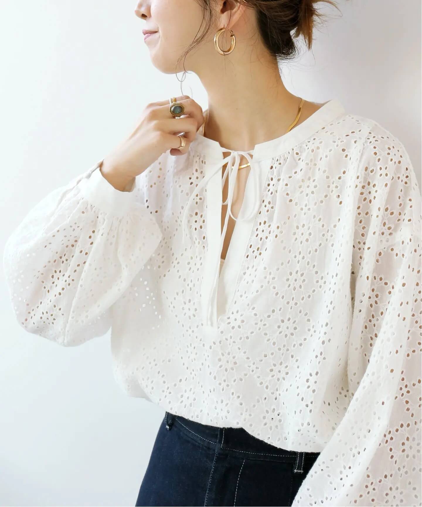 今顔レースブラウススウィートに振らない、こなれたレースブラウスをセレクト。ハンサム派さんには、スキッパー襟やノーカラーならさらに甘さがおさえられて辛口ボトムスと好相性なのでおすすめ。