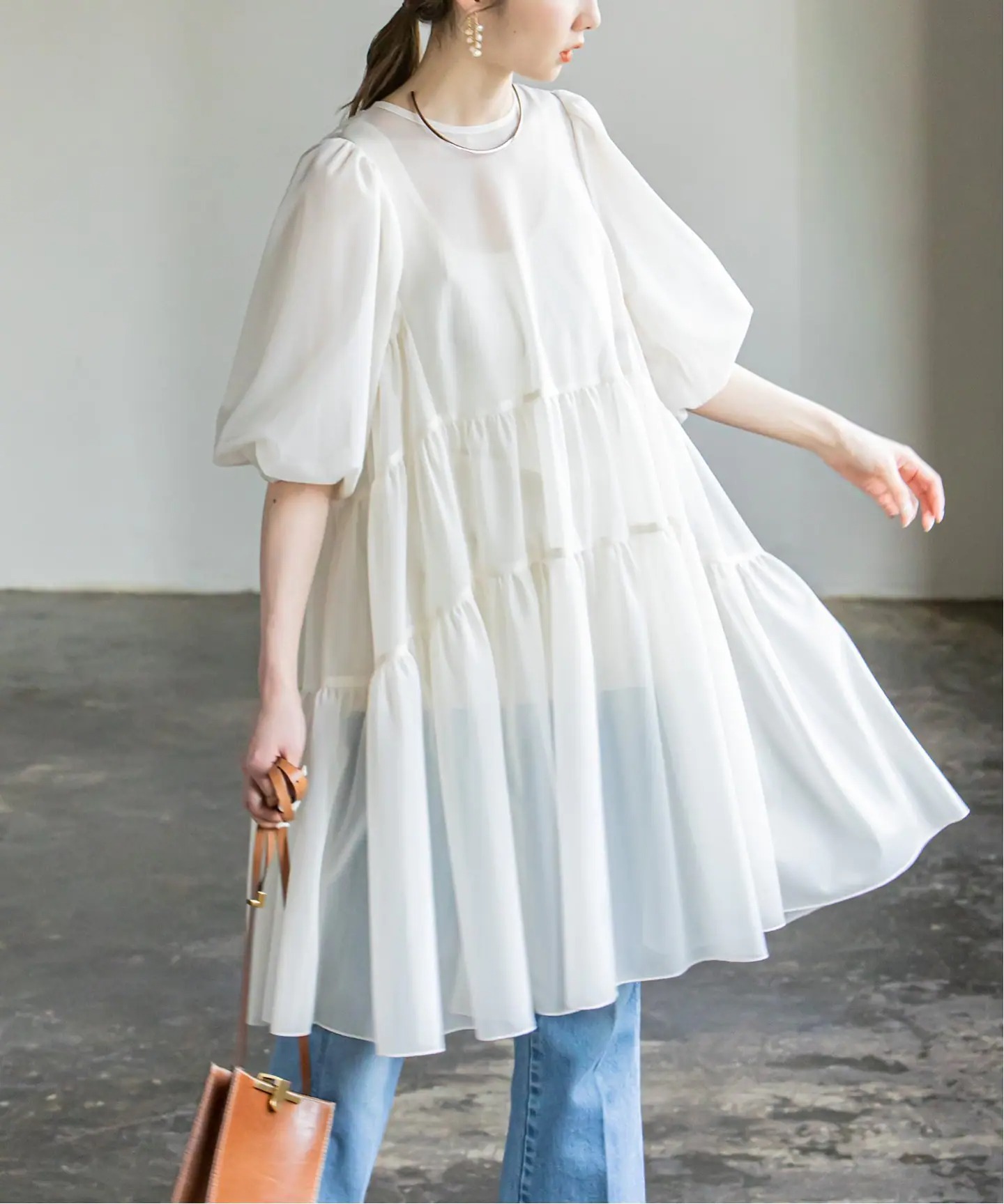 チュニックブラウス動くたびにドラマティックに揺れるティアードデザインのチュニックブラウス。シアー素材で抜け感を出したりバックプリーツでメリハリをつけたり、大人っぽくまとえる工夫を。