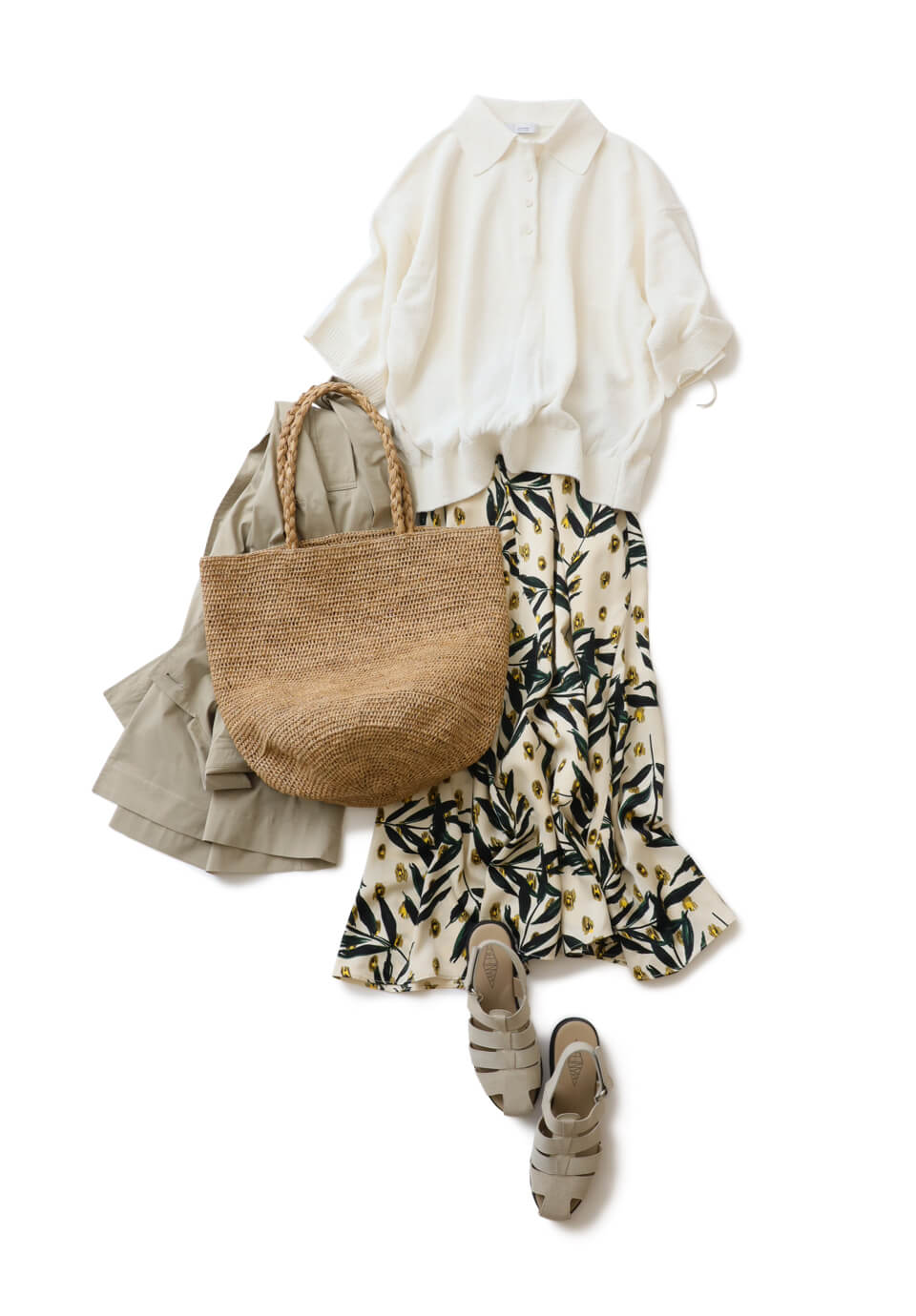 春らしい爽やかなボタニカル柄スカートを主役にしたフェミニンカジュアル。白ベースのスカートと相性の良い白トップスは、メンズライクなムードも漂うポロシャツを合わせたのが今っぽい。カゴバッグやグルカサンダルが、春のぽかぽか陽気にぴったり。とはいえ朝晩はトレンチコートもお忘れなく。