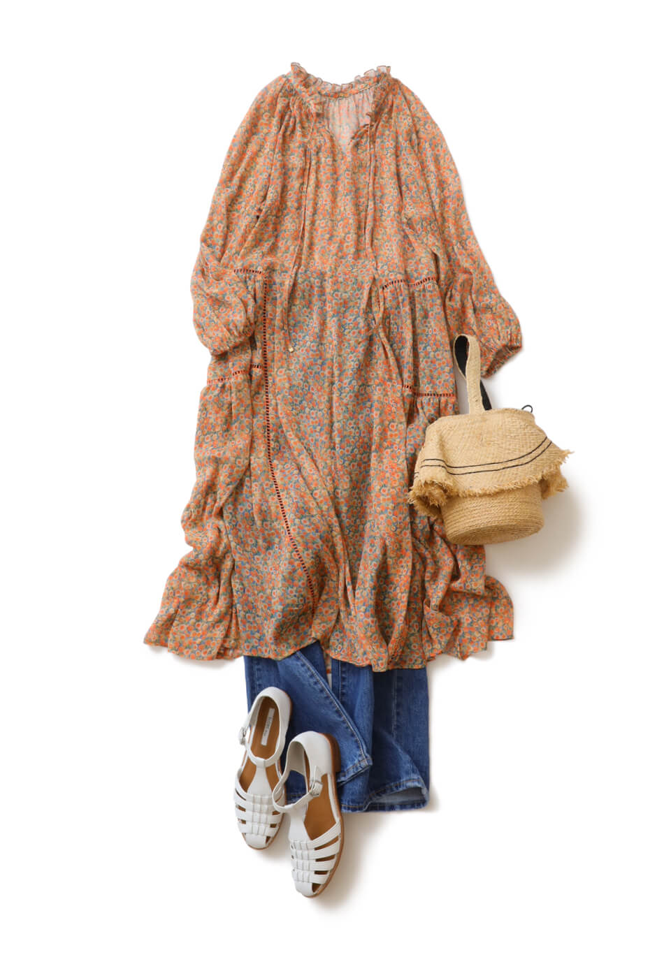 柔らかく透ける素材に繊細な小花柄をあしらったソフトなワンピースなら、トレンドのオレンジも照れずに取り入れられそう。デニムをレイヤードして、カジュアルなラフさもプラスして。フリルがワンポイントのラフィアバッグや白のグルカサンダルをトッピングして、さらにお洒落ムードを底上げ。
