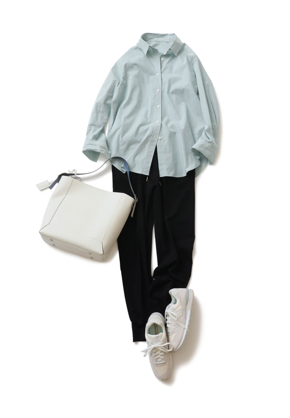 大人スポーティーな黒のジョガーパンツに白のバッグ&シューズをトッピングしたスタイリッシュなモノトーンカジュアル。トップスのストライプシャツは、今年らしいグリーンの爽やかなカラーに衣替えして印象チェンジ。まじめすぎず爽やかな、最旬シャツコーデを楽しんで。