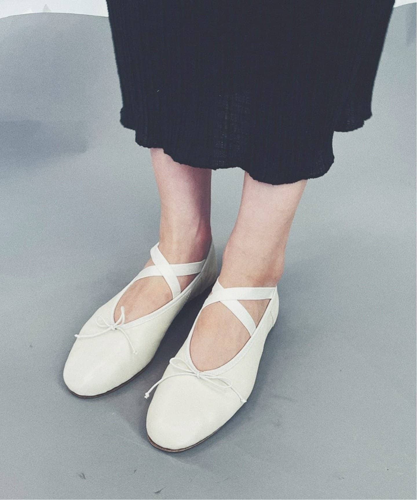白バレエはひとくせデザインに注目ラクにはけて上品なフレンチシックスタイルに仕上がる便利な白バレエシューズ。スクエアトゥやクロスストラップといったひとくせの効いたデザインで差をつけて。